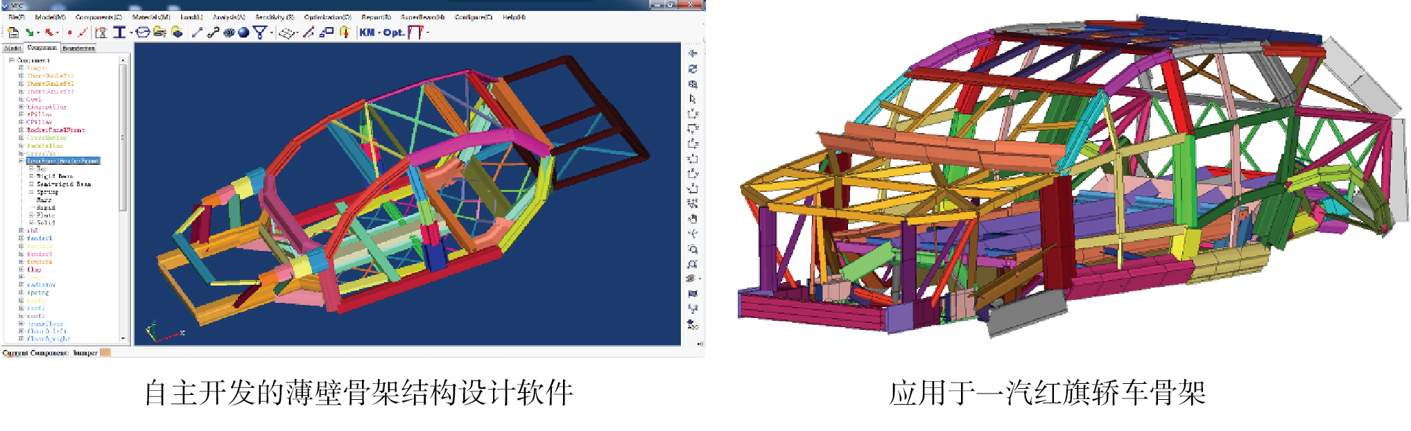 To accelerate the conceptual design of frame structures, a simplified modeling method is proposed to create beam frame using the thin-walled beams with complex sections and semi-rigid spring elements. Meanwhile, the cross-sectional shapes of thin-walled beams are optimized to achieve the lightweight frame considering stamping process. A computer aided engineering software is also developed to design the thin-walled frames, such as automobile body and civil structures.