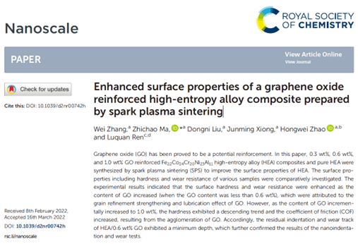 The advance of new equipment technology imposes stricter requirements on the properties of basic materials. Globally, up to 80% of components are damaged every year due to different forms of wear, and improving the surface mechanical property of materials contributes to prolonging their service life. Given that traditional metal materials cannot meet the needs, metal matrix composites provide new opportunities. Recently, JLU Prof. Zhao Hongwei’s team has obtained new progress in the surface modification of nanocomposites. The relevant paper entitled “Enhanced surface properties of a graphene oxide reinforced high-entropy alloy composite prepared by spark plasma sintering” was published in the prestigious academic journalNanoscale, and selected as the inside front cover paper in the current issue.