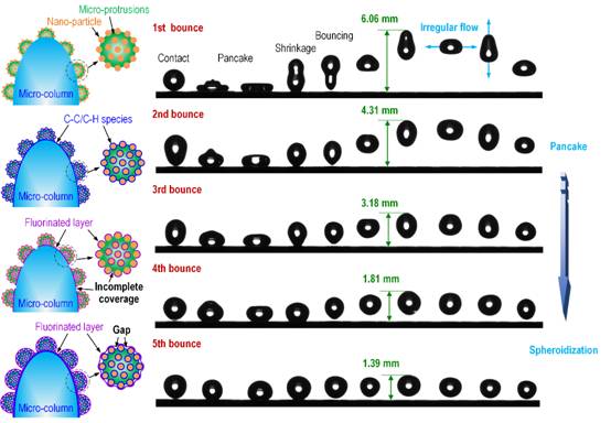 Based on the “lotus effect” with a Cassie-Baxter state, a unique quaternary “micro-column-micro protrusions-nano particle-fluorinated layer” cross-scale structure was prepared on titanium alloy by laser ablation, organic adsorption and fluorination treatment. Micro-column array structure with cross-linking morphology was fabricated on the surface of titanium alloy by laser ablation, followed by high-temperature organic adsorption for 4 hours and fluorination treatment for 0.5 hours, achieving a contact angle of 164.2°, a slide angle of 7.8°,and five times of drops bouncing. With the increase in the number of droplets bouncing, the lateral spreading degree of droplets on the surface gradually decreases, and droplets tend to spheroidize. According to the measured surface chemical composition distribution, a “mechanical spring” composed of the gap between the organic adsorption layer and the fluoride layer and a “mechanical spring” effect to promote the multiple droplet bouncing are proposed.