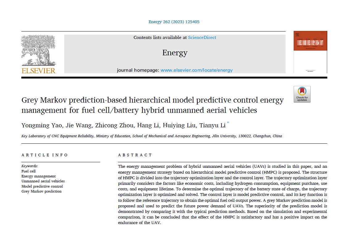 Recently, SMAE Prof. Yao Yongming’s team has made new progress in the research on the application of triboelectric nanogeneration technology and fuel cell/battery technology in UAVs. The related research results were published in the internationally renowned academic journalsNano Energy(IF: 19.069) andEnergy(IF: 8.857), with Jilin University as the author’s first affiliation. “Arc-shaped flutter-driven wind speed sensor based on triboelectric nanogenerator for unmanned aerial vehicle” was published inNano Energy, with Prof. Yao Yongming as the first author, and Prof. Cheng Tinghai from Beijing Institute of Nanoenergy and Nanosystems, Chinese Academy of Sciences and Associate Professor Lu Xiaohui from the Changchun University of Technology as co-corresponding authors. Postgraduate student Zhou Zhicong and others participated in the research. Another paper “Grey Markov prediction-based hierarchical model predictive control energy management for fuel cell/battery hybrid unmanned aerial vehicles” was published inEnergy, with Prof. Yao Yongming as the first author and Associate Professor Li Tianyu as the corresponding author. Postgraduate student Wang Jie and others participated in the research. The research was sponsored by the National Natural Science Fund (51805200), Jilin Province Science and Technology Development Plan (20200201057JC), etc.