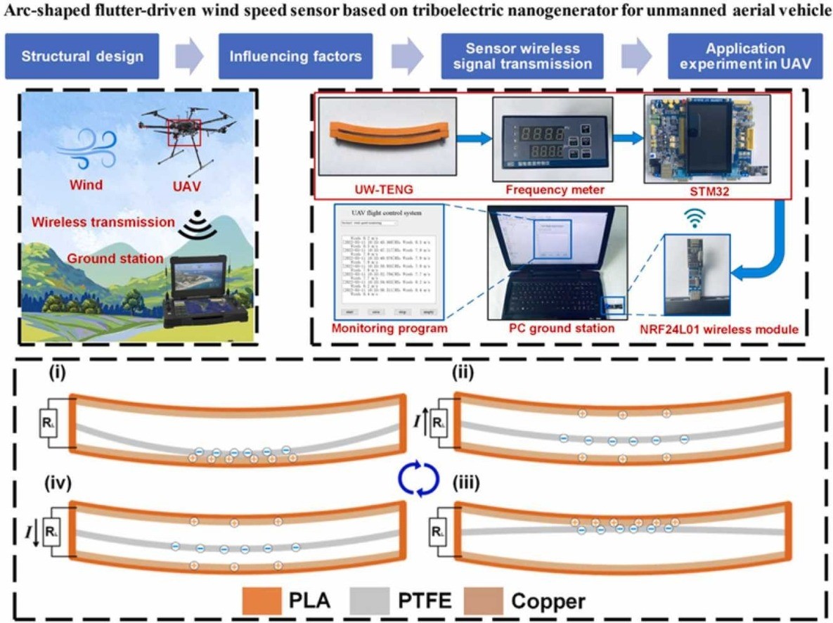 The research group proposed an arc-shaped flutter-driven wind speed sensor based on triboelectric nanogenerator (AW-TENG) for UAV. Based on the streamlined shape of UAVs, an arc structure design was adopted, which realized contact separation and generated electrical signals through air vibration in the wind field environment. According to its working principle and simulation analysis, researchers conducted an experimental analysis of three influencing factors of plate spacing, radian and radian direction to determine its optimal structure. The sensing performance was verified, which showed that AW-TENG had good goodness of fit and other sensing properties in the wind speed range of 6-20m/s. On this basis, the application experiment of the wireless wind speed transmission was carried out. The new sensor has a good application prospect in the UAV field. The research has expanded the application field of the TENG sensor and provided technical support for TENG wireless self-powered sensing.