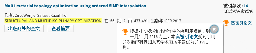 日前,公司左文杰教授发表于结构设计领域代表性期刊《Structural and Multidisciplinary Optimization》的论文Multi-material topology optimization using ordered SIMP interpolation入选基本科学指标数据库(Essential Science Indicators,ESI),成为工程技术领域高被引论文,平均引用数(引用数/出版时间)进入学科领域最优的1%之列。