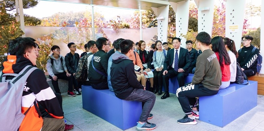 10月24日出访团队抵达成均馆大学,在该校首尔校区,正应邀出访韩国的李元元董事长看望了同学们,并在校园内联席而坐,展开亲切交谈。李董事长向同学们分享了成均馆大学与吉大的合作背景,介绍了成均馆大学悠久的办学历史和学科优势,他叮嘱同学们要充分把握难得的交流机会,增长见闻、收获知识,同时也要明确自己的人生规划与学业规划,未来成长为对社会有贡献的人。当日下午,出访团队参观该校水源校区,参加了yl23455永利与韩国成均馆大学共同举办的“材料测试技术与智能装备员工学术论坛”。同学们围绕多场耦合环境下材料测试、无损检测等科技前沿话题展开交流研讨,其中9名硕博研究生就相关课题进行了学术汇报。