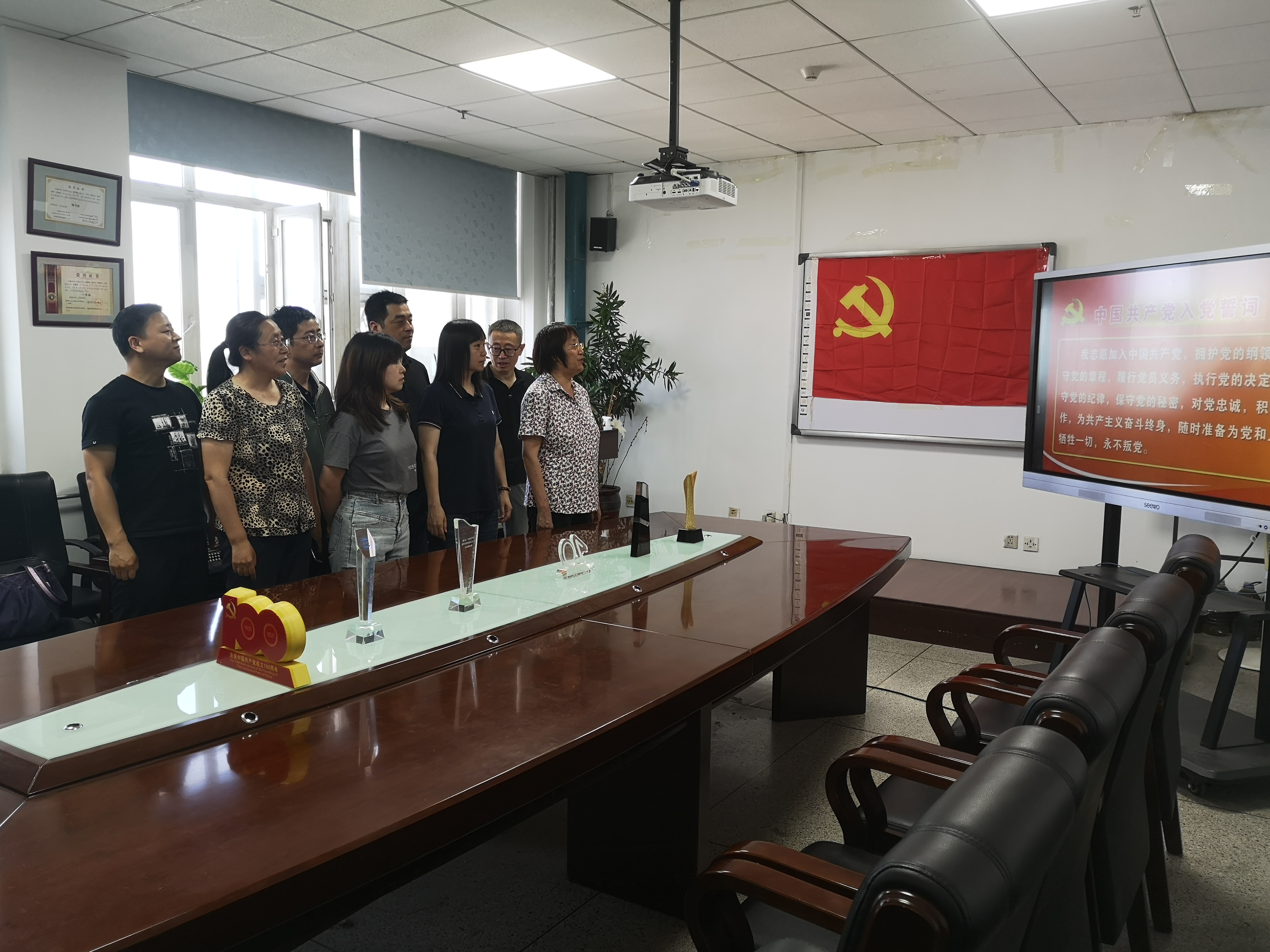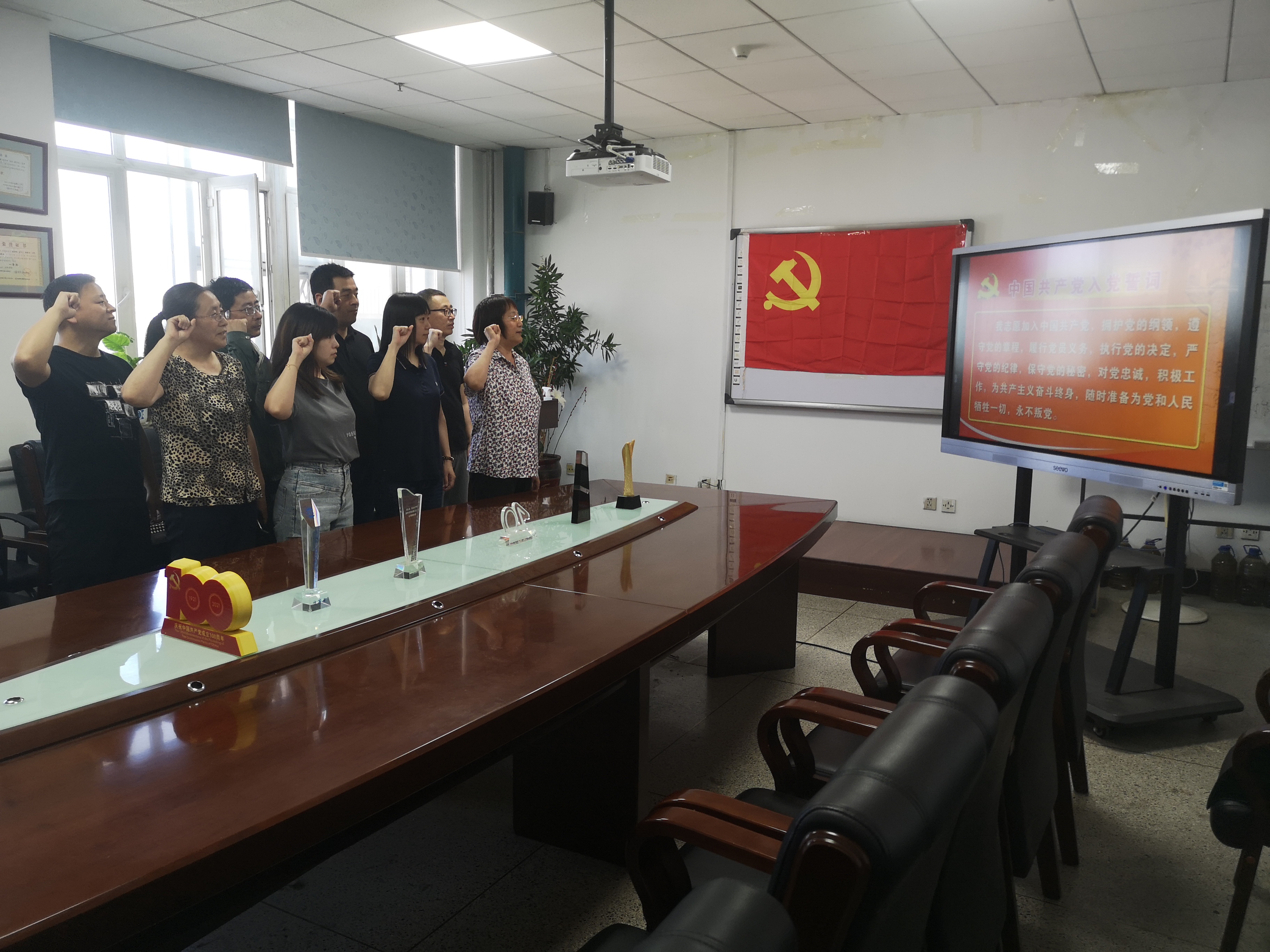 为庆祝中国共产党建党一百周年,坚定共产主义理想信念,2021年6月23日下午,工业工程系教工党支部在机械馆525室举行“重温入党誓词,坚定理想信念”主题党日活动。