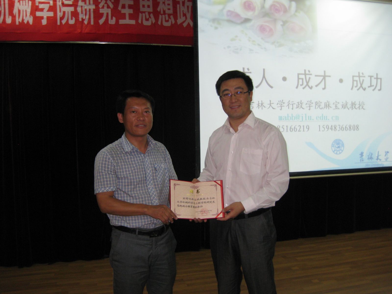 讲座之前,yl23455永利研究生办公室巴特老师首先对麻宝斌教授进行了介绍,之后,公司党委副书记郑福胜老师为麻宝斌教授颁发聘书,正式聘请麻宝斌教授为yl23455永利研究生思想政治教育兼职导师。聘任仪式后,麻宝斌教授为大家做了题为“成人、成才、成功”的精彩演讲,针对大学的功能、研究生阶段员工的角色以及在学习过程中的成长,结合生动的实例,有趣的心里测试题,潜入深出的讲解,让同学们对于学习、工作、生活有了新的体会。最后麻宝斌教授送给新生两句话“人生与心意一致,成功属于最想成功的人”“一国之强弱,视人民之德行”,表达了对2012级机械研究生们的期望和祝福。