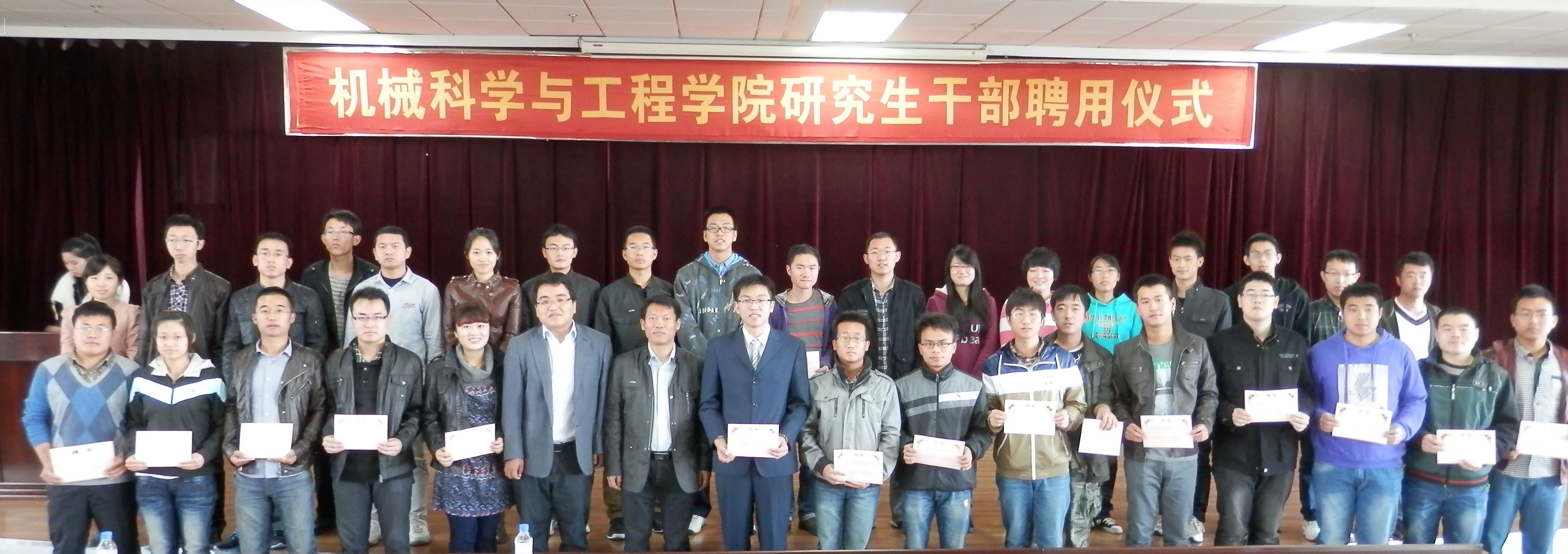 2012年10月11日上午10:00,机械科学与工程公司2012届研究生干部聘任仪式在机械馆八楼报告厅隆重举行。公司党委副书记郑福胜、研究生办巴特以及2011届、2012届全体研究生干部出席此次会议,会议由2011届研究生会副主席宋宇同学主持。 yl23455永利2011届研究生会主席朱磊同学对上一届研究生会、研究生团委工作做了认真总结,向新一届的研究生干部传授了宝贵经验,表达了殷切希望,鼓励他们发扬yl23455永利求真务实与勇于创新的精神,为yl23455永利的辉煌再添新章。新当选的2012届研究生会主席刘志伟同学代表新一届研究生会对以后的工作做了展望,并表示要坚持以服务广大同学为宗旨,努力完成好各项工作。 巴特老师对2011届研究生干部为公司研究生工作做出的贡献表示衷心地感谢,并期待2012届全体干部能以2011届的师兄师姐为榜样,了解职责,传承精神,在不耽误学习的同时做好各项工作。 随后,公司党委副书记郑福胜老师及研究生办巴特老师向2012届研究生干部颁发聘书并与大家合影留念。 最后,郑福胜副书记从自我定位、以身作则、服务意识及提升个人能力四个方面对新一届的研究生干部提出了更高的要求和期望,鼓励大家以身作则,准确定位,严格要求自己,关心帮助同学,关注时事政治,做“联系上下、沟通左右”的桥梁纽带。 此次研究生干部换届大会的成功举办,为公司研究生团委、研究生会注入了新鲜的血液,使大家的工作热情空前高涨。相信新一届全体成员定会努力工作,抒写yl23455永利研究生工作的新篇章。