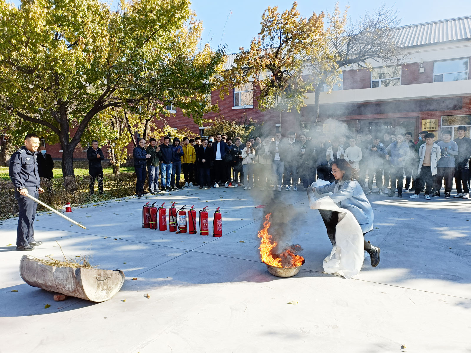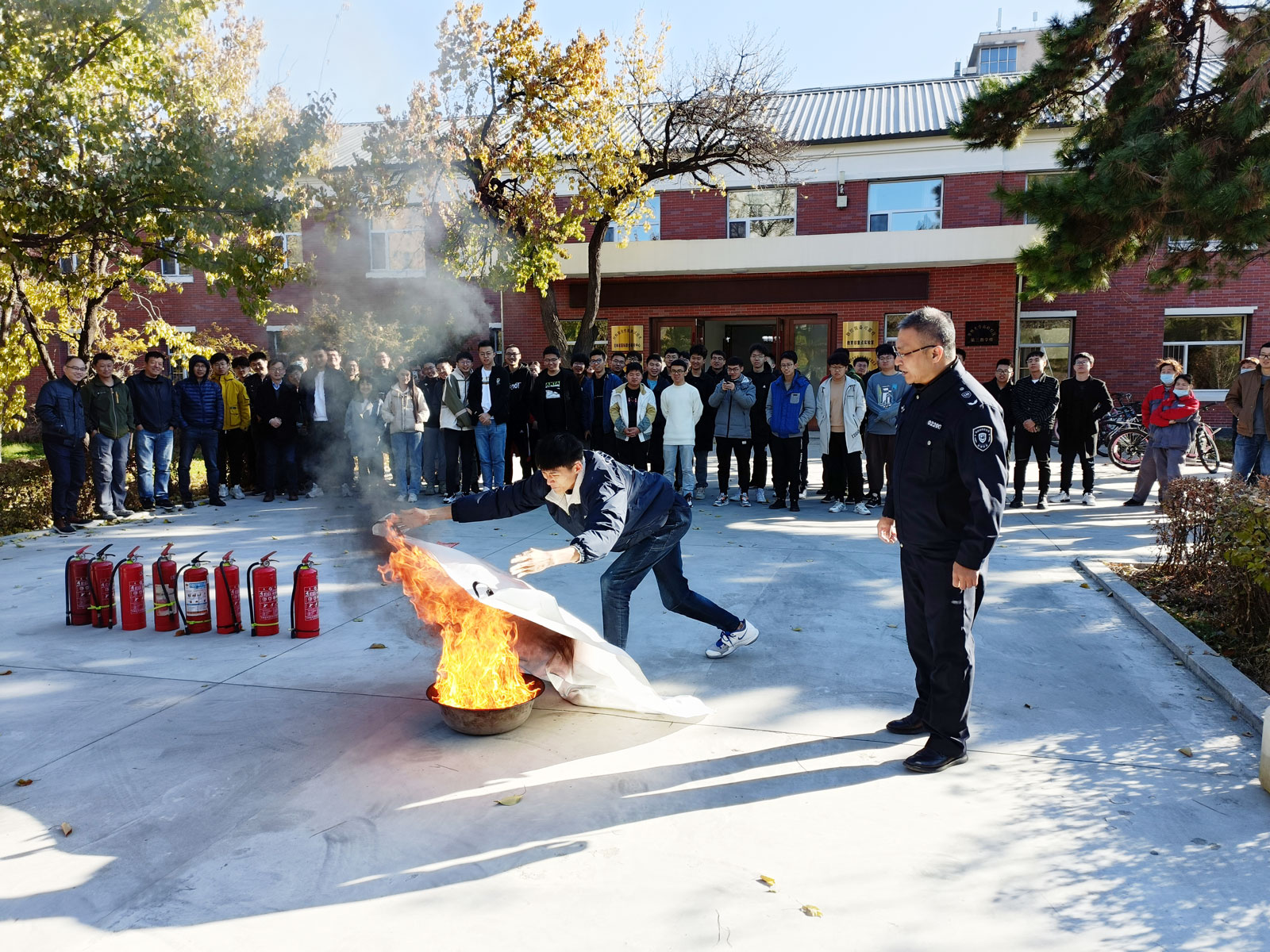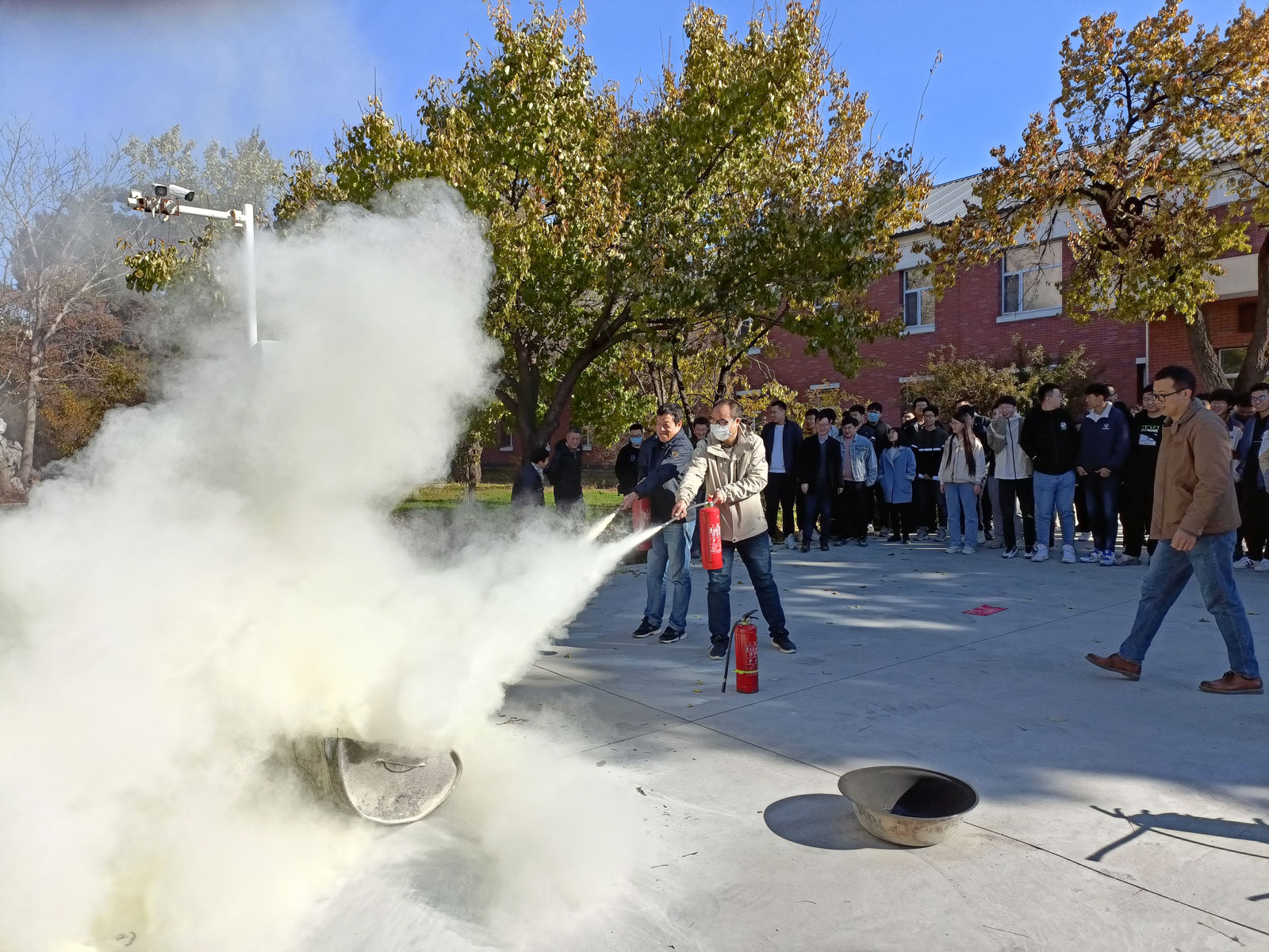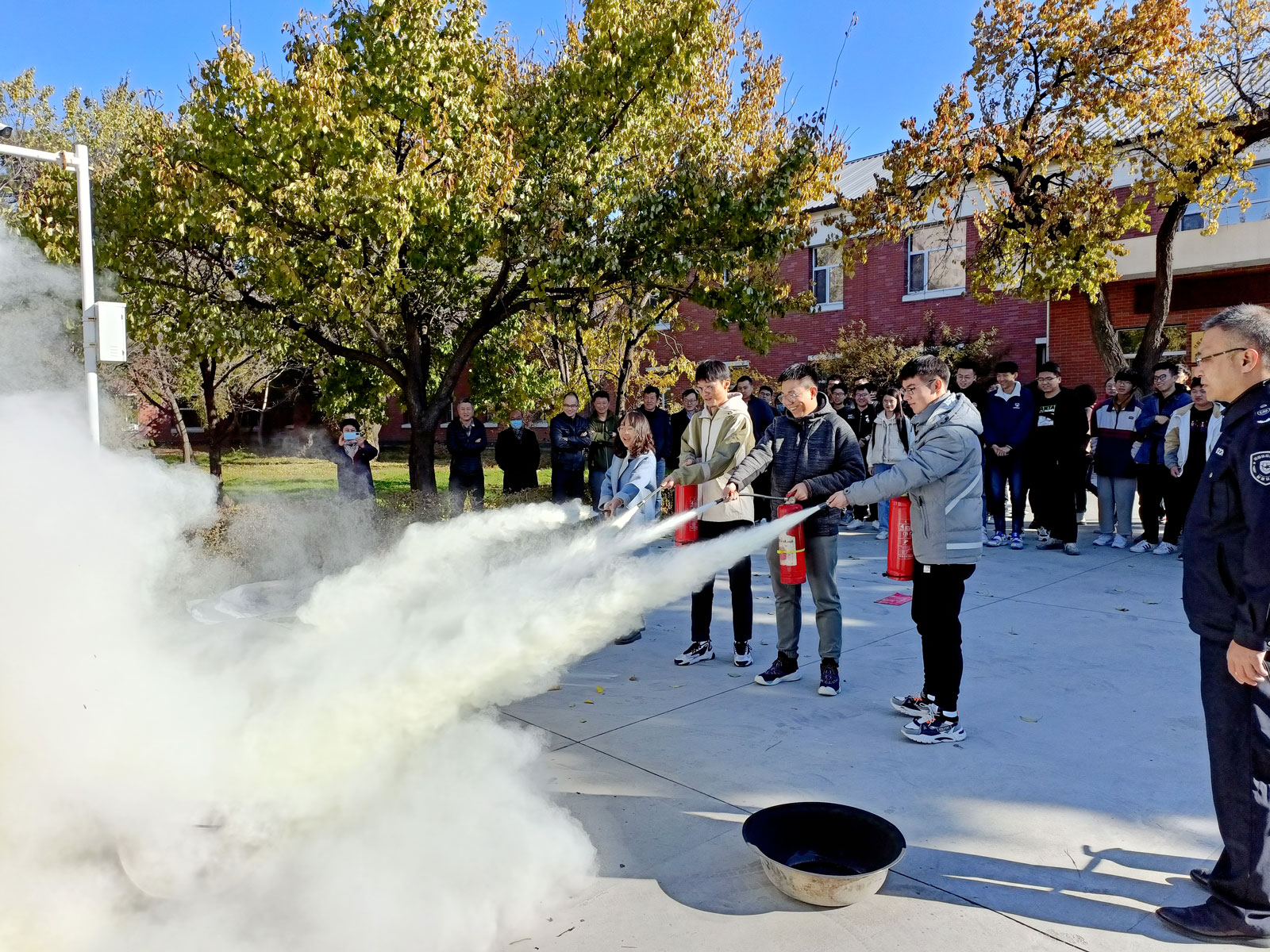 现场师生兴趣盎然、踊跃参与,在保卫办的指导下,进行了实地灭火演练。