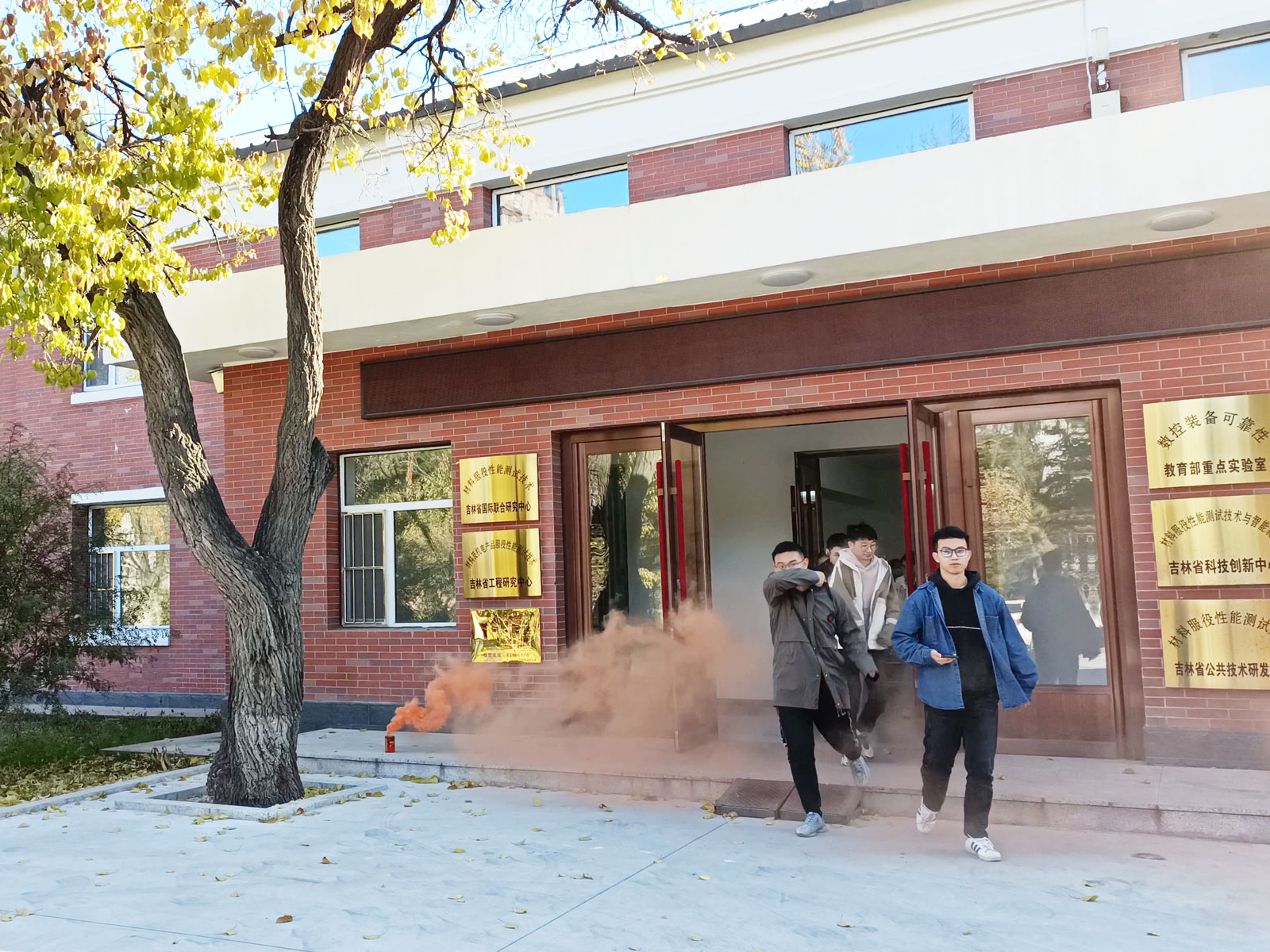 首先,东区保卫办防火科科长韩旭在三教正门预置了浓烟,并拉响了火灾警报。同时楼内响起关于“请大家有序撤离”的中英文对照提示。师生们按照消防疏散灯具提示方向,遮掩口鼻、低姿穿过浓烟,迅速而有序地撤离到安全地点。