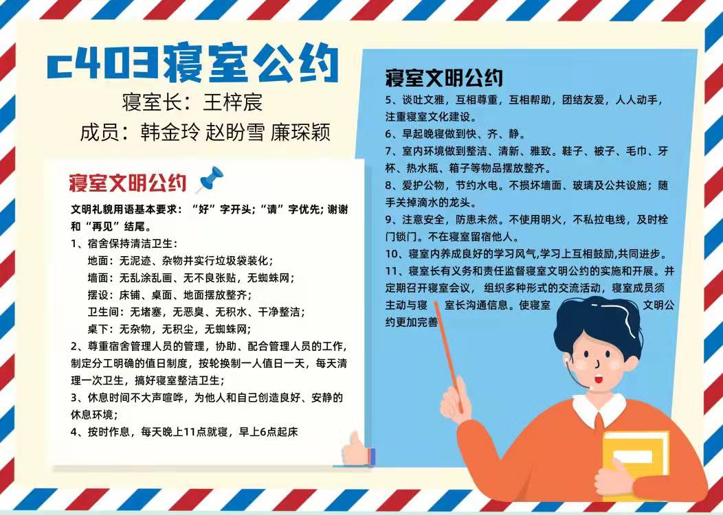 为进一步加强公寓文化建设,发挥公寓育人阵地作用,推动员工寝室制度化、有序化管理,引导员工养成良好的生活习惯,营造文明和谐、干净整洁的寝室文化氛围,公司于10月20-25日开展了全员参与创建寝室文明公约活动。寝室公约是寝室共同居住成员在遵守公司规章制度的前提下,就作息时间、值日制度、寝室安全等方面,经友好协商、普遍认可、自主约定形成的公共准则。组织员工签订寝室公约对促进寝室和谐、减少寝室矛盾、增进同学情谊、增强寝室凝聚力具有重要意义。接下来,公司将统一印制文明公约海报,统一张贴在寝室内,全员签约。希望同学们信守公约,共同创造一个“安全、文明、卫生、和谐”的生活环境!
