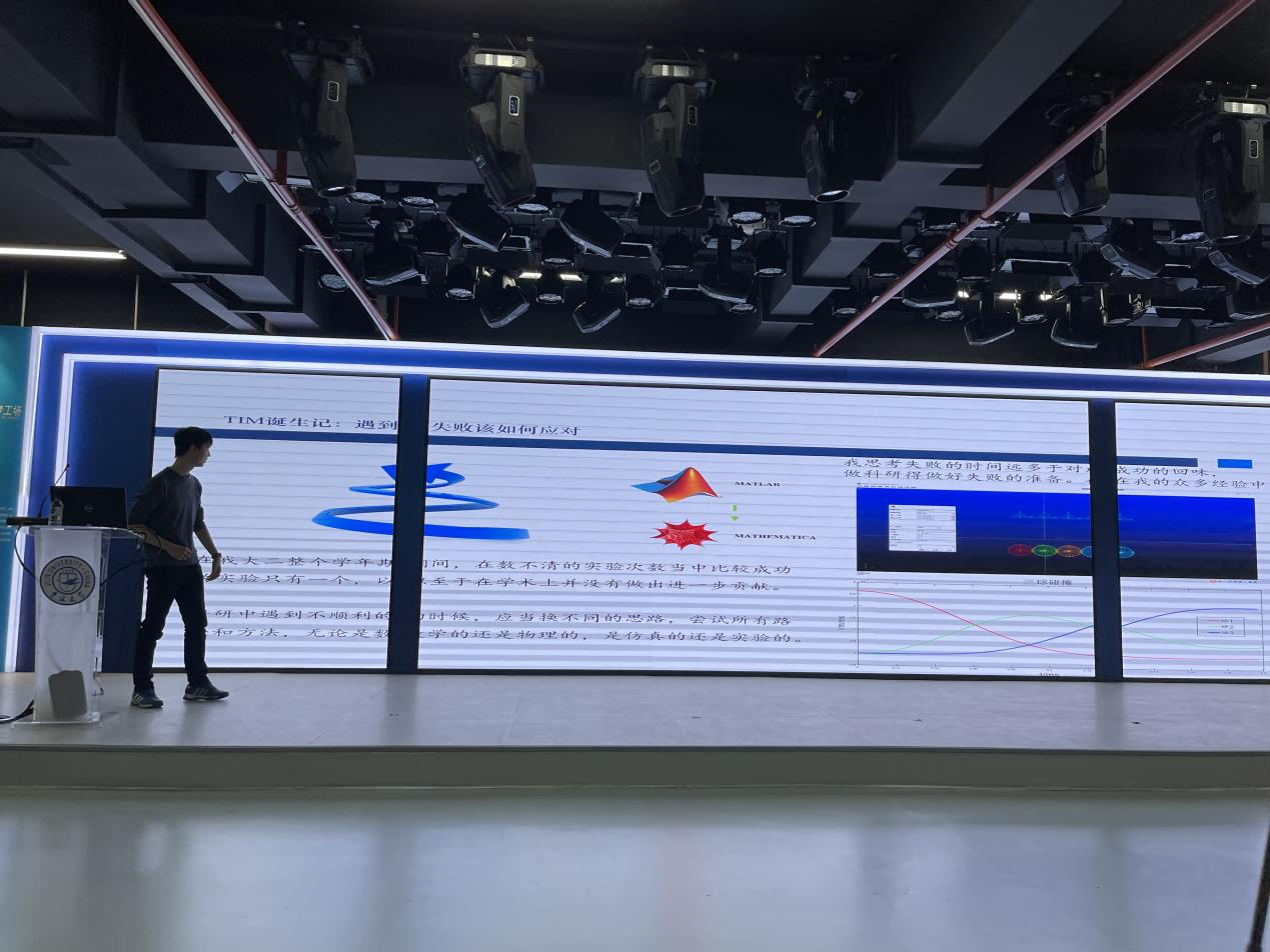 硕士研究生代表陈少康、傅武杰以《TIM诞生记:培养学术素养和创新能力》为题,结合他们参与“源创计划”的亲身经历,鼓励同学们积极参加全国老员工数学建模竞赛、物理学术竞赛、机械创新设计大赛等学科竞赛,通过理论研究和实践探索,不断提升自己的科研素养。要保持好奇心不断去发现科学问题,要学会化繁为简去解决科学问题。做科研的过程都不是一帆风顺的,需要团队成员协同合作,经过多次试验、无数次失败,坚持下来才能品尝到成功的果实。