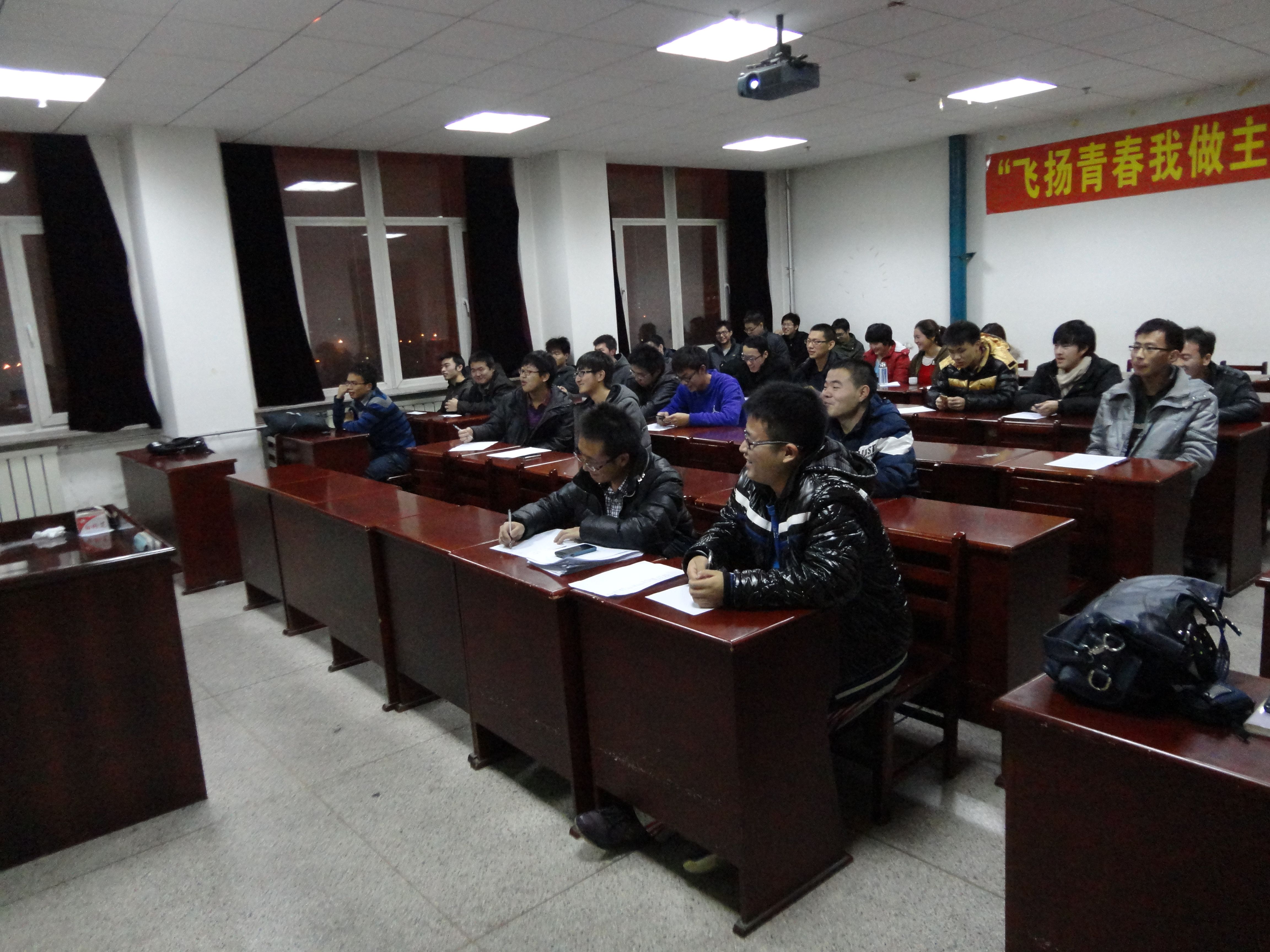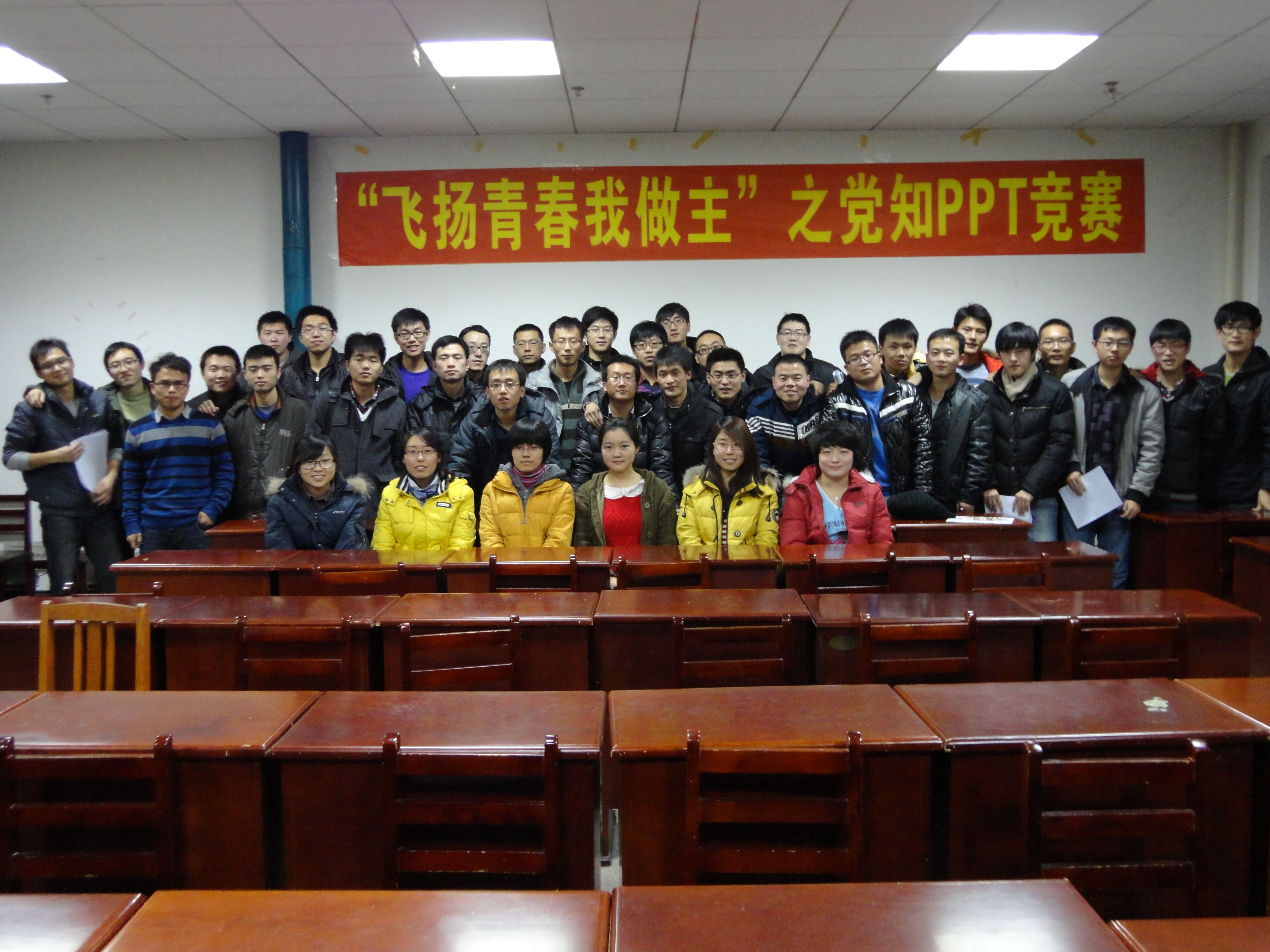 2012级机制硕士党支部43人于2012年11月18日在机械馆529多媒体教室开展了以“飞扬青春我做主”为主题的党知自我教育PPT竞赛活动,活动分为两大板块:前期的大力度宣传、同学们的自我学习与现场PPT演讲竞赛。