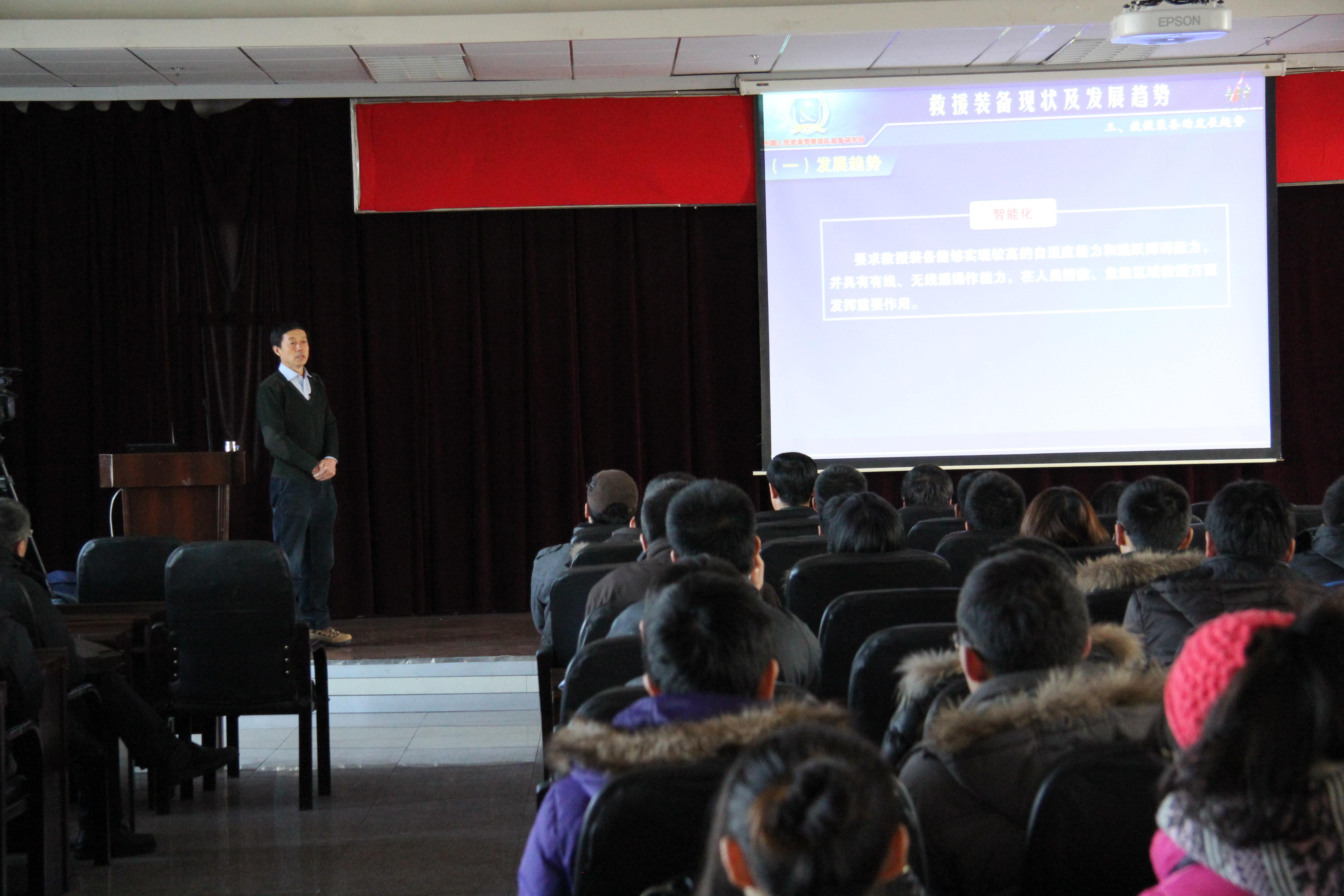 陈晓东大校围绕反恐救援机器人装备发展历史、现状和未来趋势,结合大量实例为在座师生讲解了反恐救援装备信息化、智能化、轻量化和系统化等发展和需求。并就轻量化与重型化、水陆两栖能力和多点协同等问题和与会师生进行了互动交流。最后,他还以中国林业生态发展促进会理事,中国摄影家协会会员和中国艺术摄影学会会员的身份,为在场师生展示了其为保护鸟类而出版的摄影作品《爱与痛的思考》,引发了师生们对环境保护的共鸣。