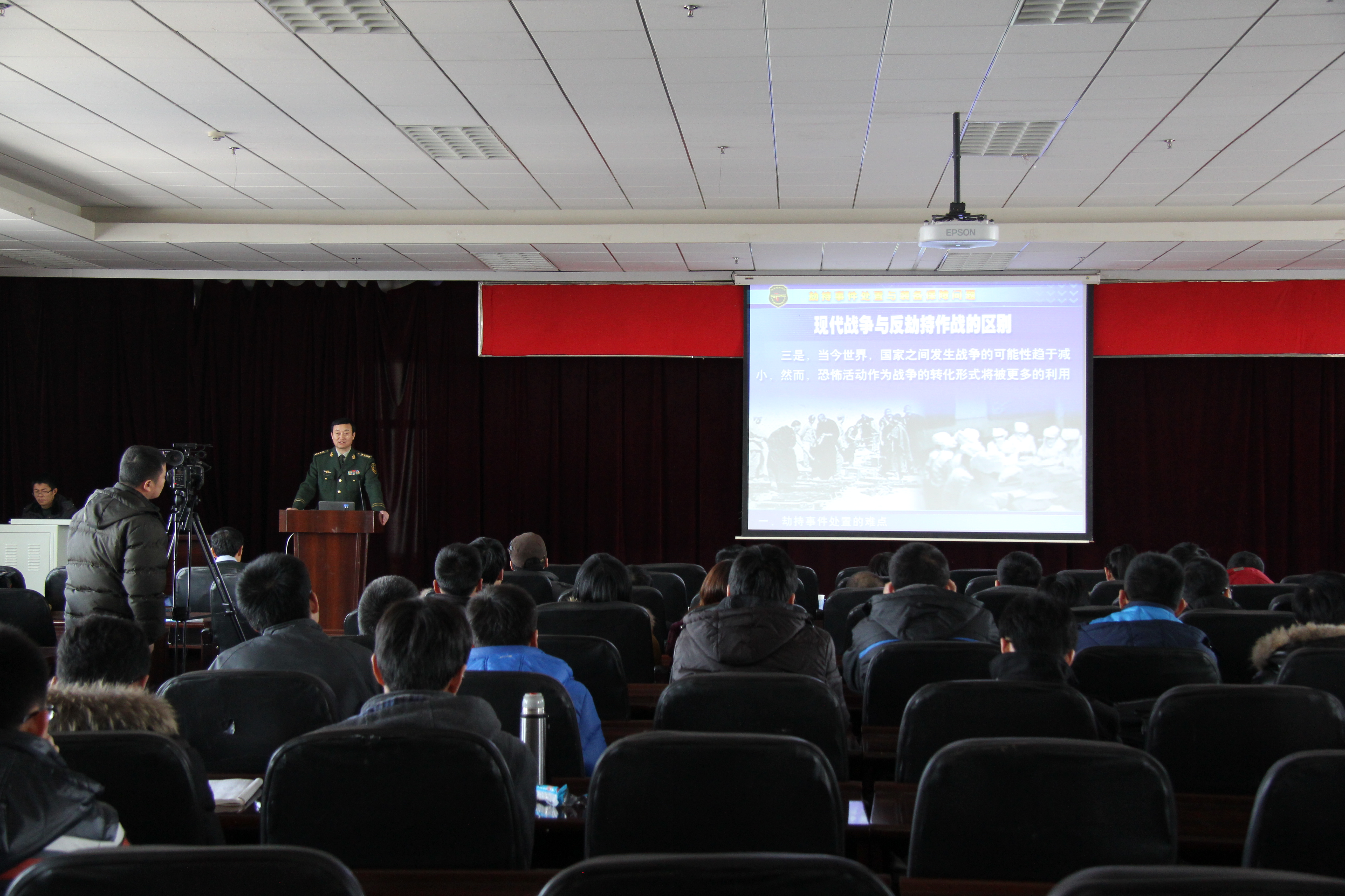 邢春洪教授结合国内外事例就劫持事件处置难点、专用装备保障重点和装备科研需要把握的重点等问题进行了深入浅出的讲解,并鼓励有志青年投身武警队伍。最后,邢教授与在座师生进行了学术交流。