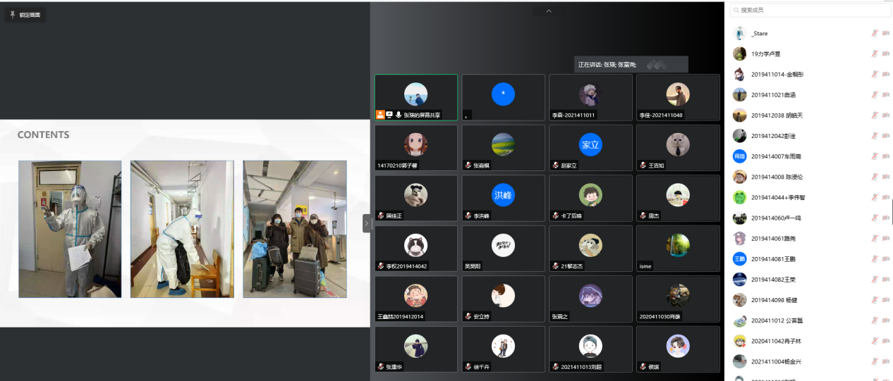 会议伊始,张瑛对参会研究生配合公司防疫工作、坚持每日健康打卡情况进行了表扬,并与大家分享了其在大学城隔离点管理专班的点滴,以亲身经历叮嘱所有研究生要提高防范意识,尊重防疫工作人员和志愿者的付出,能够理性面对疫情信息,做到不信谣、不传谣、不恐慌。