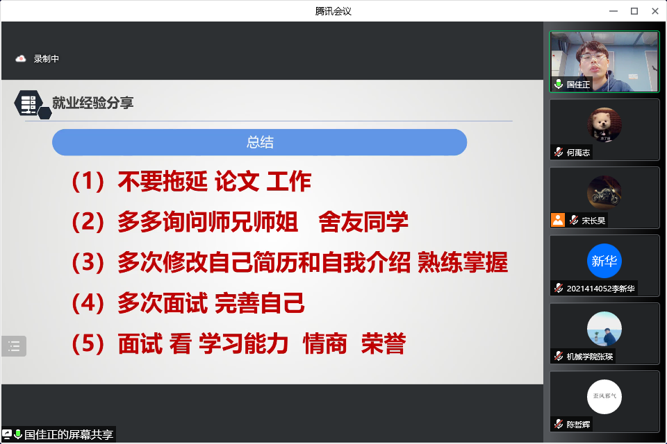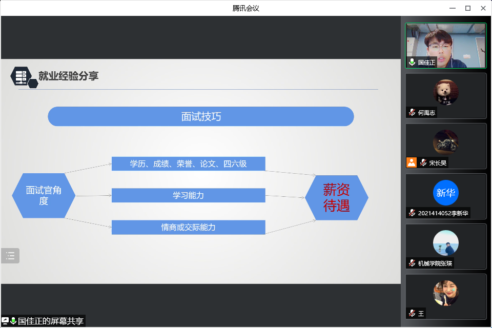 国佳正,19级硕士研究生,中共党员,校优秀研究生干部、国家励志奖学金获得者,目前收获众多国企、私企、选调生录用通知,拥有各行业、各领域丰富的求职经验。国佳正同学结合自身的求职经历,在国企、私企、公务员招录等不同领域,围绕简历制作、面试、复试等各个环节详细展开。在国企方面,国佳正以一汽集团为例介绍了整个招聘规则、流程和自身经验;在私企方面以华为技术有限公司为例阐明了技术面试的基本流程、部门设置及薪资待遇和定岗定级的细节要求;在公务员招录方面,他以北京选调为例陈述了选调生考试的相关事项,并对公务员考试的笔试、面试技巧分享了独到的见解。国佳正还提出了几点宝贵的总结经验,告诫同学们切勿拖延论文,充分利用身边人脉资源获取信息,多多面试完善自身。最后,针对不同就业规划的同学提出的问题,国佳正一一解答并希望大家都能通过自身努力找到心仪的工作,前程似锦,未来可期。