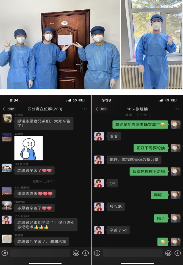 记得刚开始传出消息要封公寓的时候,慌乱地去买吃的喝的,去屯物资,生怕自己挺不过这场疫情“寒冬”,但后期发现这完全就是多此一举,公司想的很周到,把我们也照顾得很好。封寝的前一晚,九公寓的负责老师和班级群都发布了志愿者招募的信息,我从心底认为,这个时候没有退缩的理由,看着我们志愿者群里的人数在慢慢的递增,看着吉大老师和工作人员在竭尽全力地保障我们的安全和日常饮食,看着看着就泪目了,作为一个在吉大7年的员工,我希望能在这种时候出一份力。