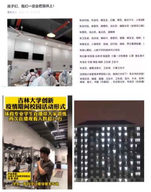 “孩子们,我们一定把饭供上!”于是在第二天清晨,我们足不出户便能收到热气腾腾的早餐,能喝到分量充足的矿泉水,能闻到新鲜水果的香气,一切充足的物资保障让我们觉得适应又不适应,你能在各种社交媒体上毫不费力的找到击中你内心的“那个点”。此刻,对吉大学子来说,yl23455永利四个字就像是定海神针一样的存在。物资互助文档、健身线上直播、正能量短视频、夜幕下的校园大合唱,吉大学子也同样用自身行动践行着疫情当前团结一心的“吉大精神”,留下了属于我们自己的精神文化符号。