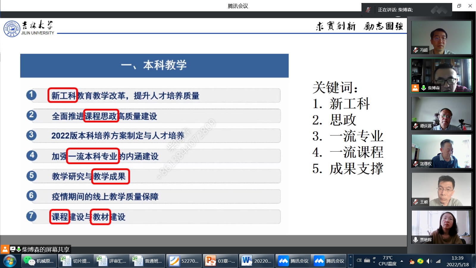 为深入贯彻落实习近平总书记对黄大年同志先进事迹作出的重要指示精神,2022年5月18日下午13:30,机械原理与设计教研室教工党支部通过腾讯会议,以“抓党建,促发展”为主题召开线上组织生活会,开展“学习、传承、践行黄大年精神”的主题党日活动。会议由机械原理与设计教研室党支部书记柴博森副教授主持,机械基础教学中心副主任董景石教授、课程教学团队负责人和教研室全体党员教师参会。