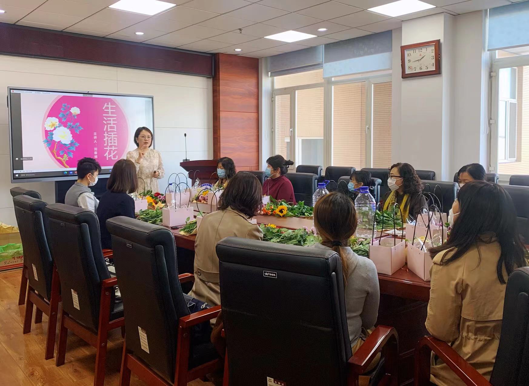 公司妇委会根据疫情防控要求,采取线上、线下相结合的形式,邀请刘春博现场讲解并指导本次主题插花活动。一是介绍国家级非物质文化遗产传统插花和现代插花、东方插花和西方插花的特点,欣赏不同流派的经典插花作品,让大家对插花艺术有了更深层次的认识;二是介绍鲜花的品种和寓意,讲解插花的基本理论知识和技巧。本次活动准备的是以喜庆的红色玫瑰和黄色向日葵为主的花材,在现场指导下,女教职工修剪花枝、确定架构、搭配色彩,结合个人对美的不同理解,充分发挥想象力和创造力,搭配出精美的花艺作品。