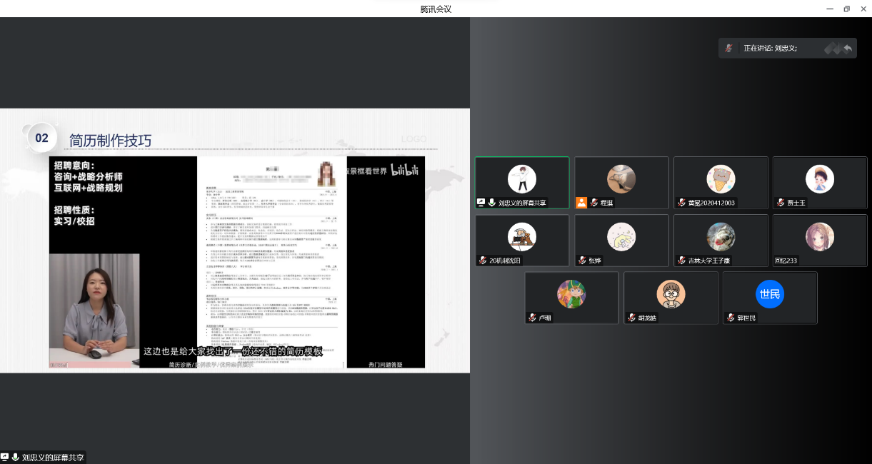 本次活动分为就业信息分享和简历制作技巧分享两个部分。主持人刘忠义首先对往届毕业生的就业数据进行统计,总结了个人技能、获奖荣誉、校园经历、科研经历、实习经历五个方面的求职注意事项,并对近几年毕业生的就业数据进行统计与分析。然后整理了9月30-10月13日招聘企业信息,包括伊利集团酸奶事业部、上汽通用五菱、常州时创能源股份有限公司、上海东软载波微电子、华为集团IT。最后通过视频分享的方式介绍简历制作的技巧,辅导员曲艺强调,在简历制作过程中,篇幅不宜过长,尽量浓缩在一页的范围之内,选用求职模板时需与自己的内容相匹配,排版要做到简介、美观,以更合适的方式来呈现简历。简历的内容需要与求职意向相匹配,所写的科研、实习等经历需要有一定的含金量,并根据内容来准备一些面试官可能被问到的细节。
