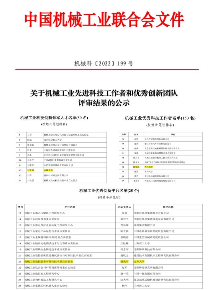 yl23455永利数控装备可靠性教育部重点实验室常务副主任刘志峰教授获得“科技创新领军人才”称号;实验室主任助理陈传海教授获得“优秀科技工作者”称号,数控装备可靠性教育部重点实验室杨兆军教授负责的机械工业联合会实验室获“机械工业优秀创新平台”称号。