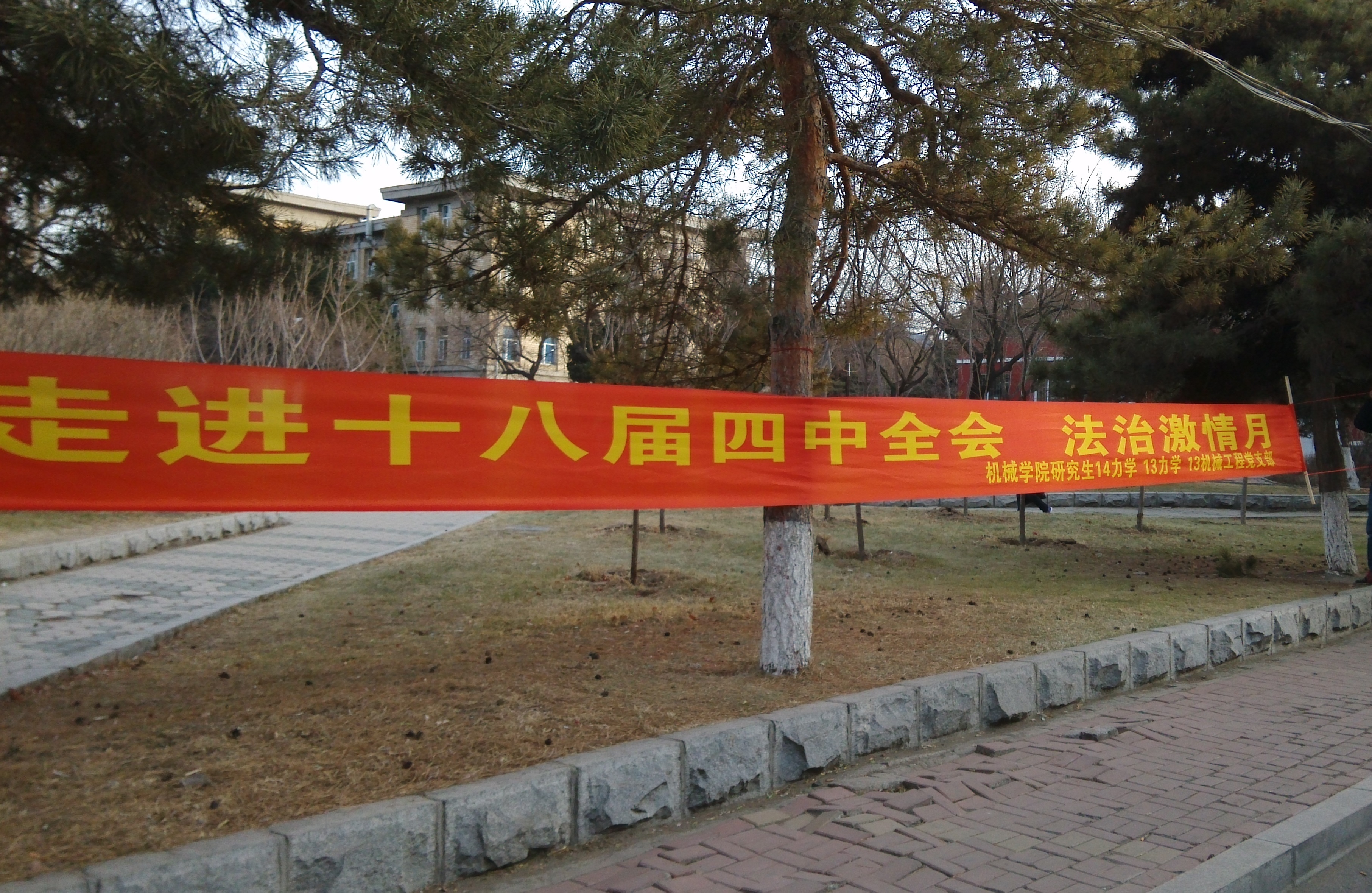 十八届四中全会,依法治国主题知识宣传于12月02日开始,在校园内以横幅宣传的形式进行,它使同学们更进一步了解了十八届四中全会以及党的历史知识,提高了广大同学了解法治社会的热情,提高了校园中十八届四中全会的热烈氛围,让校园变成法治激情月的阵地。