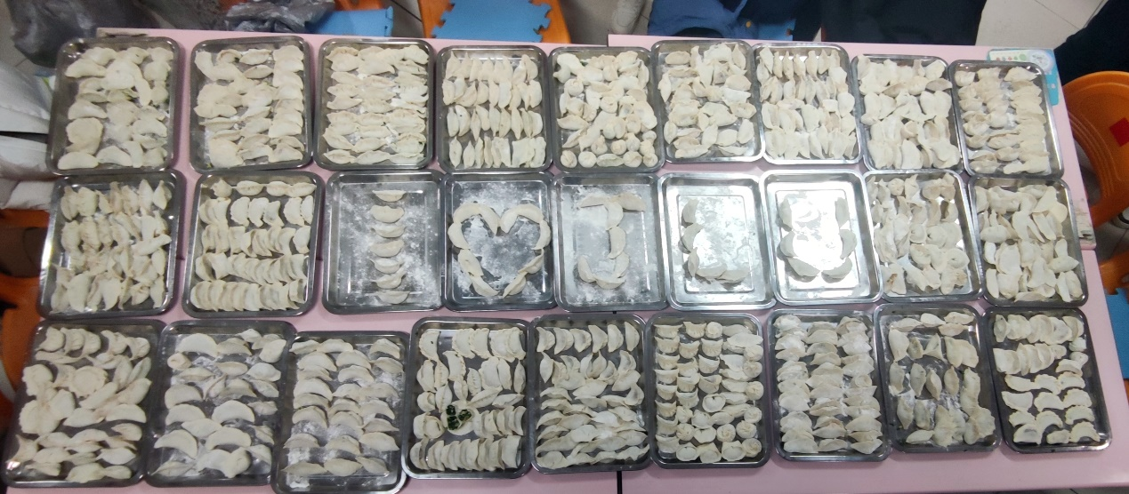 本次活动属于员工心理健康指导中心开展的“朋辈协力·心理成长”系列活动,在项目指导教师张瑛的支持下,心理朋辈辅导员郭爽组织了本次活动。活动开始前,郭爽及研究生团委工作人员提前与南岭校区二餐管理员沟通并布置活动用品及场地。下午两点,黄莹、张瑛、曲艺以及研团成员依次到场。大家以小组为单位,分配食材、道具,开始了“包饺子比拼”。各组成员相互学习,分工合作,期间穿插着糖果问答、面粉传递等趣味互动,场面十分热闹。黄莹老师大显身手,为“厨房小白”演示如何包出形状各异、绝不“露馅”的饺子。最后大家的成果合并在一起,共同摆出团圆的形状。饺子煮好出锅,大家在一片欢笑声中品尝美味,让这皑皑初冬弥漫起融融暖意。