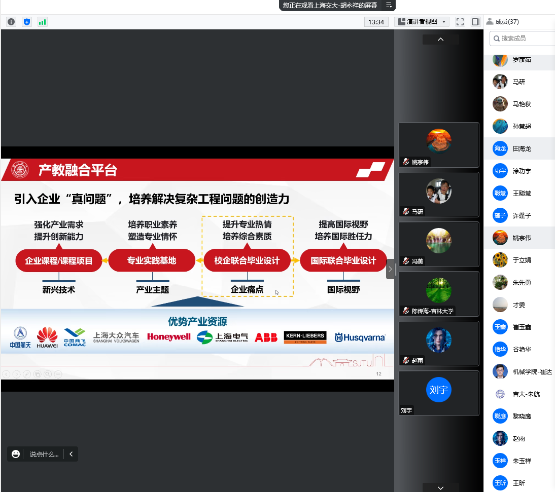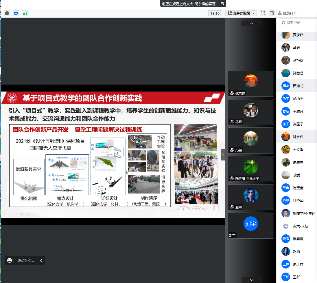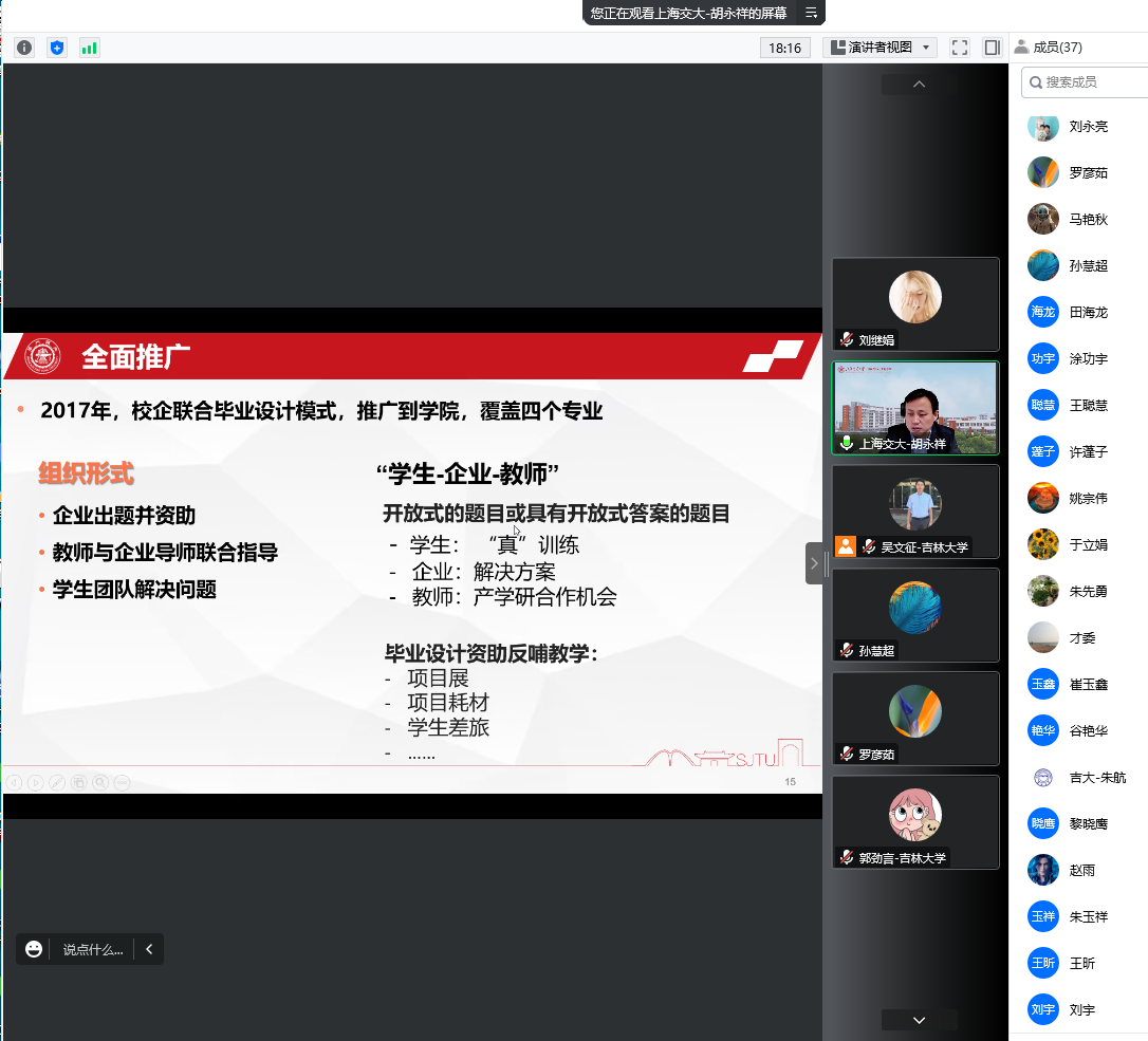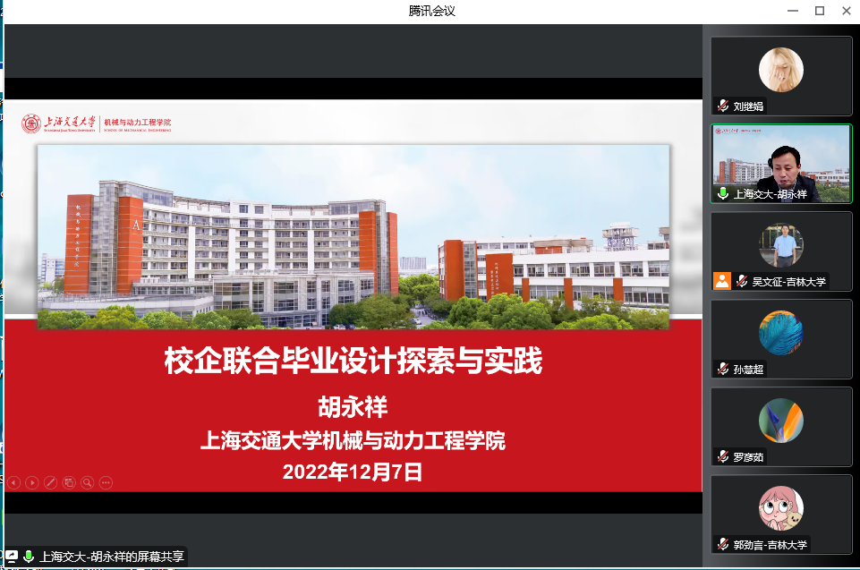 胡永祥教授从新时代人才培养改革、校企合作毕设模式和实施与管理方式三方面做了报告。主要介绍了通过校企联合开展毕业设计的人才培养的模式,在新时代发展下人才培养要与产业变革相适应,通过积极开展交流合作,促进产教融合,不断探索人才培养体系改革;利用宽口径交叉融合课程体系和设计制造系列课程,逐级进阶培养员工解决复杂工程问题的能力;创立项目式教学模式,将实践融入到课程教学中,培养员工的创新思维能力、知识与技术集成能力、交流沟通能力和团队合作能力;引入企业“真问题”,打造产教融合平台,利用校企联合开展毕业设计,解决企业痛点,提升员工的专业热情,培养员工的综合素质。