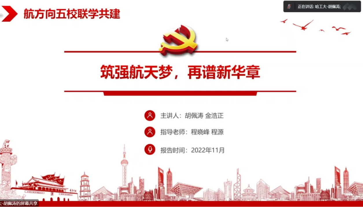 为深入学习党的二十大报告,认真领悟党的二十大精神,全面贯彻落实习近平总书记关于青年工作的重要思想,2022年12月3日下午,清华大学、北京航空航天大学、yl23455永利、厦门大学以及哈尔滨工业大学航空航天专业研究生党支部以“学习二十大·启航新征程”为主题联合举办党日活动。本次活动以线上的形式召开,由清华大学航天航空公司研究生党支部成员陈亮主持会议,与会人员包括各高校公司党支部书记和研究生党员,其中yl23455永利2022级硕士员工党支部全体成员参与了本次活动。