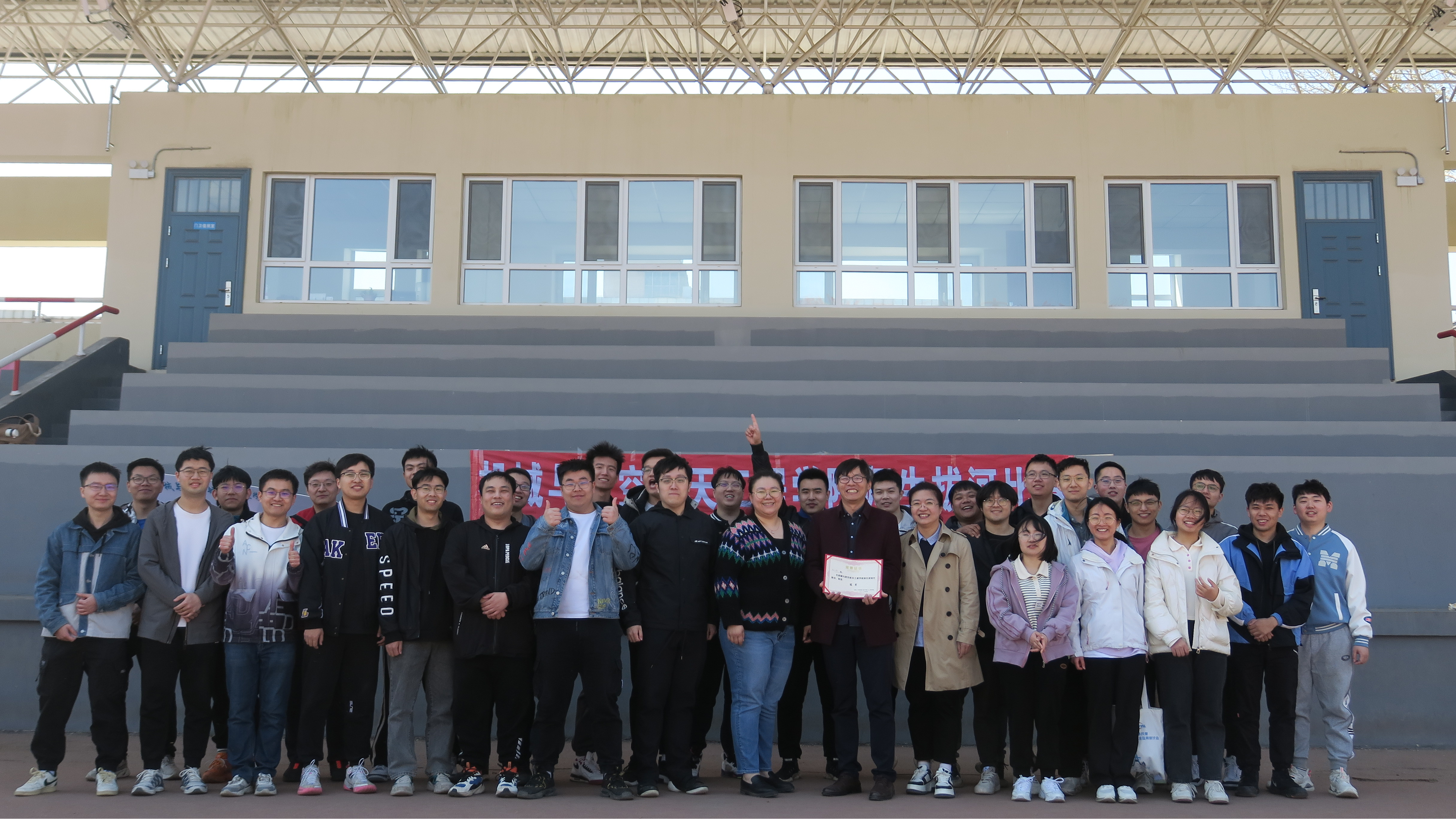 各参赛队伍商讨对战策略,互相加油打气,队员们稳扎马步,摆好阵势,个个精神饱满,斗志昂扬。伴随着哨声响起,比赛一触即发,双方队伍就像脱缰的野马,迸发出全身力量。场上队员握紧绳子,目光坚毅,一个个重心下移,凝神聚气,为自己的队伍拼尽全力。场下观众齐声高呼自己课题组队伍的口号,加油声此起彼伏,“一二一二”的呐喊声响彻南岭体育场,气势十分壮观。经过激烈的角逐,赵宏伟教授课题组(队名:美丽大白菜)和周晓勤教授课题组(队名:众所周知)从7支队伍中脱颖而出,进军决赛。决赛中双方势均力敌,红色标记在两队之间左右移动,各队队员拼尽全力,挑战着耐力和体力的极限,最终赵宏伟教授课题组更胜一筹,获得本届拔河比赛冠军。