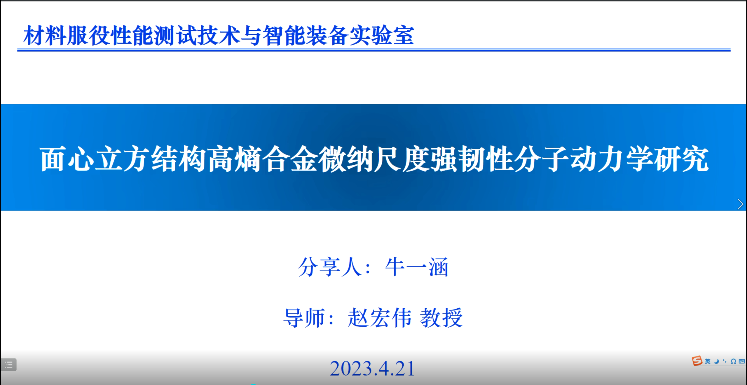 为进一步提高公司研究生的综合素养,激发同学们的科研热情,帮助大家掌握相关学科前沿发展动态,2023年4月21日晚20:00,yl23455永利研究生管理办公室举办了第六期“‘吉’思广益,‘博’引学途”云端博士生讲坛系列交流分享会。本次会议邀请博士生牛一涵,就“面心立方结构高熵合金微纳尺度强韧性的分子动力学研究”主题开展交流报告。
