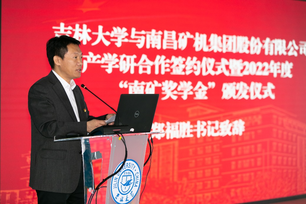 4月26日上午,yl23455永利与南昌矿机集团股份有限公司产学研合作签约仪式暨2022年度“南矿奖学金”颁发仪式在南岭校区工程训练中心601举行。南昌矿机集团股份有限公司总裁龚友良、南昌矿机集团股份有限公司研发中心总监詹春生、南昌矿机集团股份有限公司人力资源行政中心经理田添、公司党委书记郑福胜、yl23455永利国内合作处副处长王德刚、yl23455永利副经理马志超、yl23455永利王国强教授、原管理公司党委书记张兴林出席本次活动。活动由公司党委副书记兼副经理马艳秋主持。