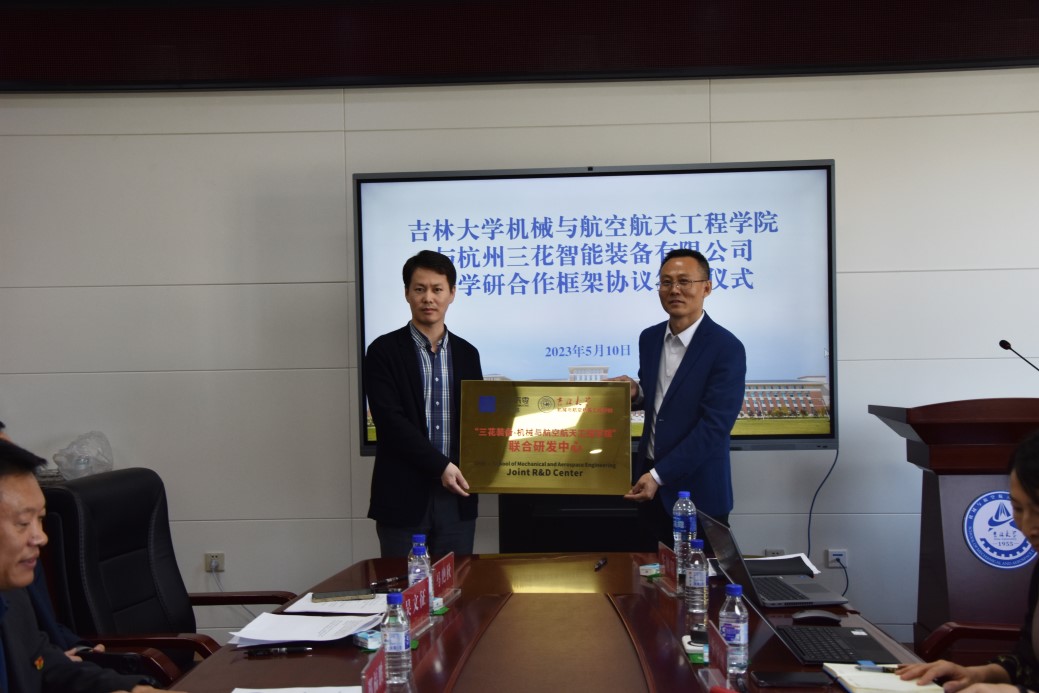 杭州三花智能装备有限公司执行总经理马志刚向yl23455永利授予“联合研发中心”牌匾。