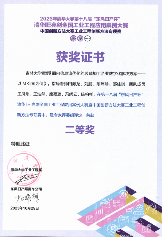 此外,10月27日-29日,第十八届“东风日产杯”清华工业工程IE亮剑全国工业工程应用案例大赛暨中国创新方法大赛工业工程创新方法专项赛在清华大学成功举行。由王凤州、王浩然、冯绣云等5名同学组成的工业工程系代表队以《面向信息流优化的玻璃加工企业数字化解决方案——以M公司为例》获高校组国家级二等奖,指导教师为工业工程系田海龙、刘鹏、陈玮峥、邬佳琪。