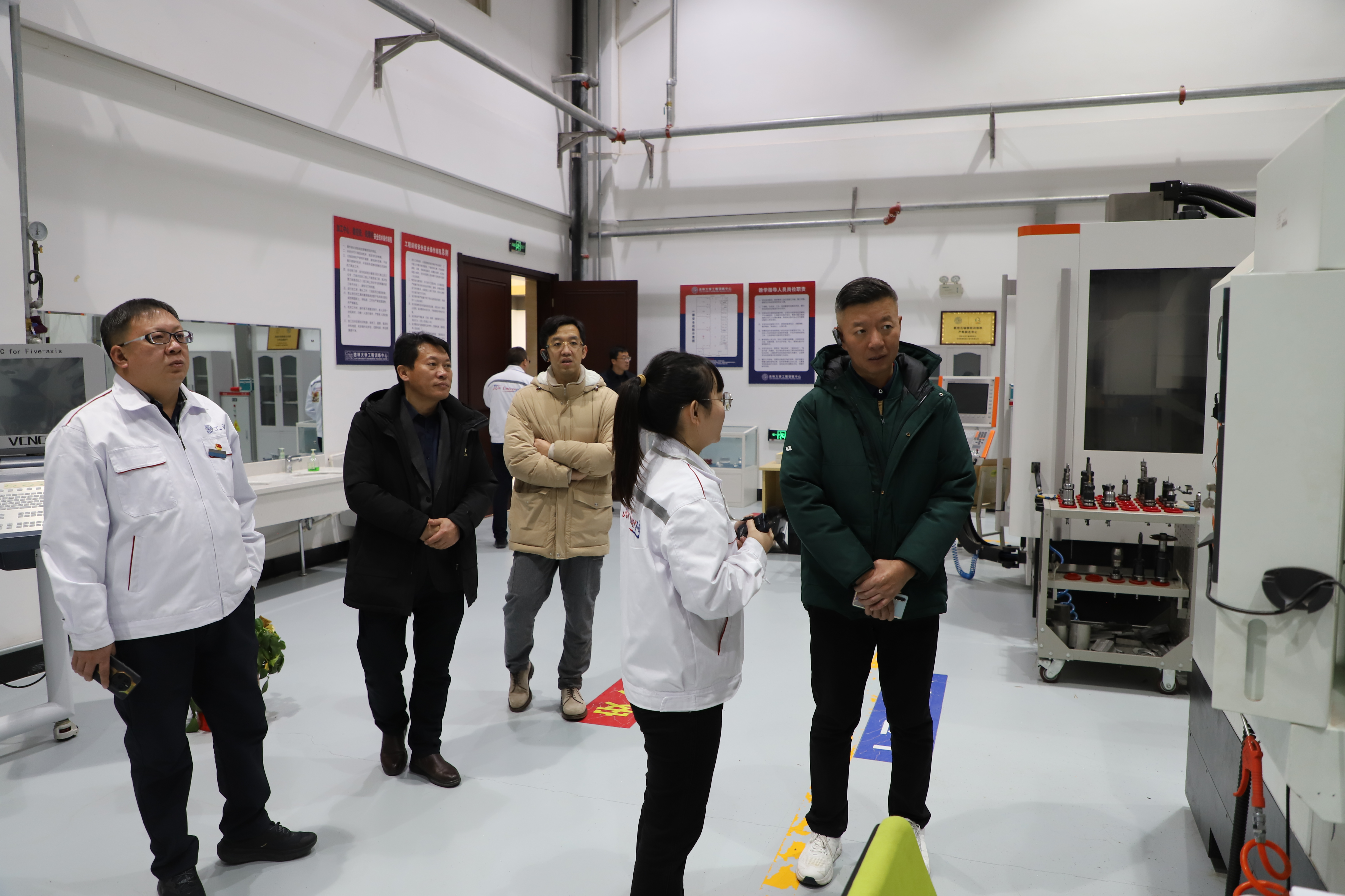 随后马佳一行走进工程训练中心,从加工中心、智能制造、激光加工到数控车、竞技机器人、多线联动等实训教学场所,对工程训练中心的实验室建设和实践教学给予了高度称赞,同时在现场也感慨着工程训练中心的巨大变化,追忆起曾经挫金工锤子的年少时光。