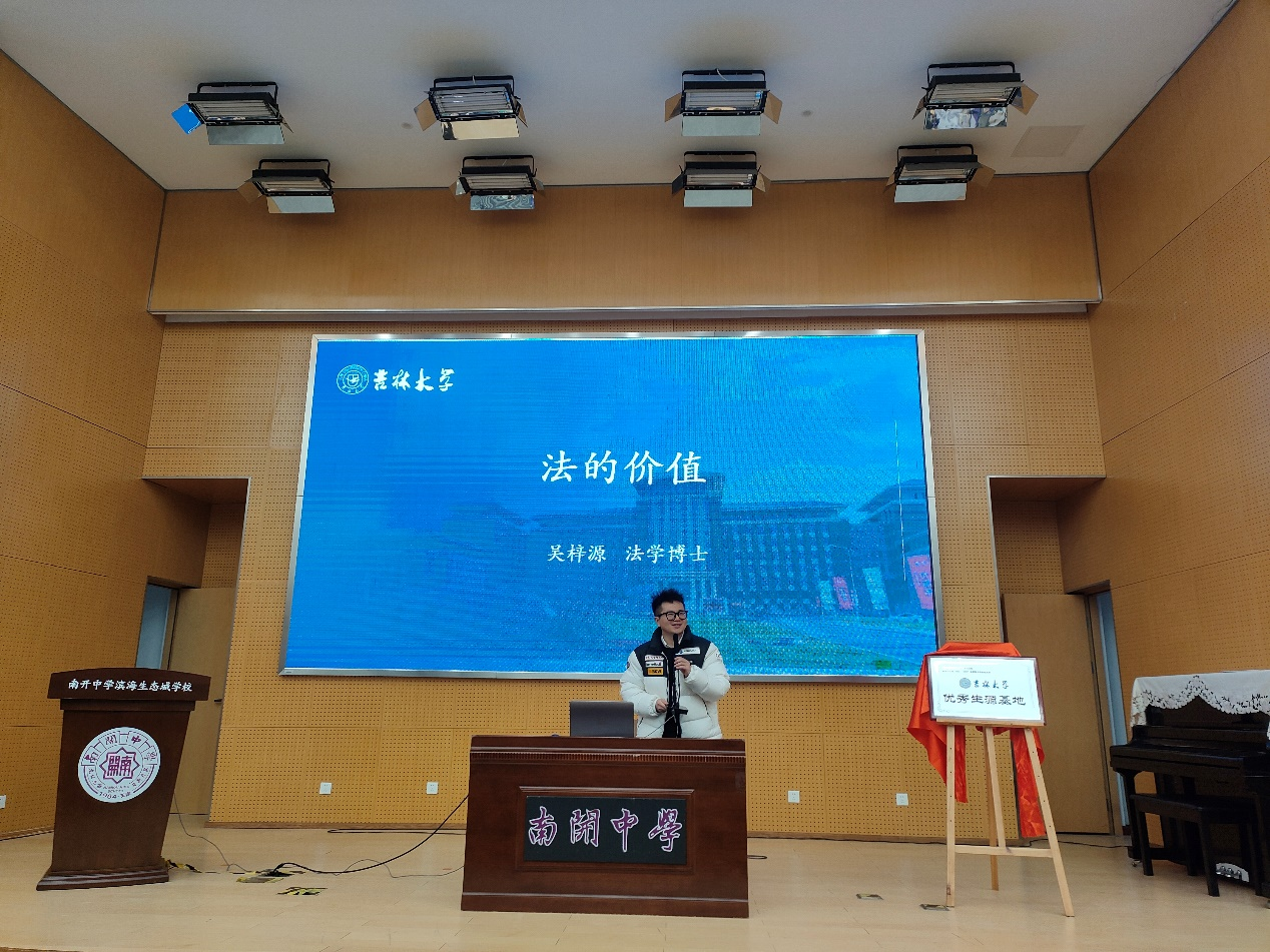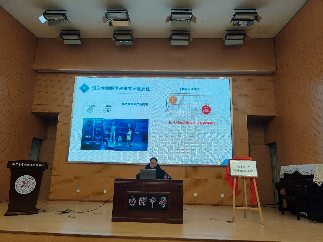 12月21日下午,招生宣传团队来到南开中学滨海生态城公司,双方进行了工作交流和优秀生源基地授牌仪式,法公司吴梓源老师做了《探索法律与正义的旅程》主题报告,基础医公司党委副书记李东洋做了生物医学科学专业介绍,最后与会师生代表合影留念。