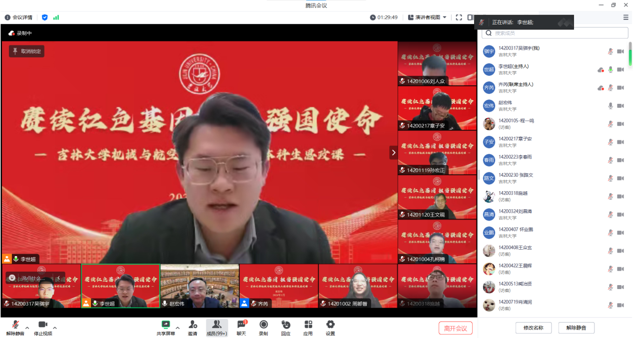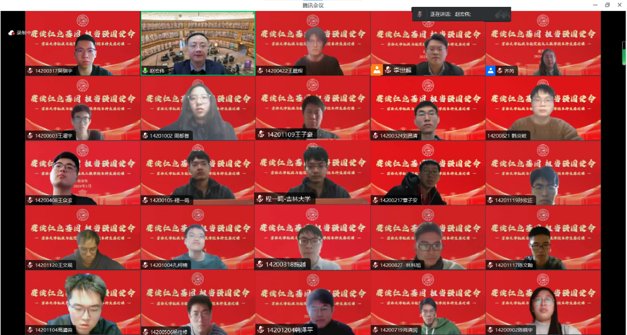 思政课上,赵宏伟老师高屋建瓴、旁征博引,同学们受益匪浅。希望广大同学们能够以此次“新年第一堂思政课”为契机,筑牢理想信念、筑深家国情怀、筑实责任担当,牢牢记取党和国家对青年的殷切期盼、公司对广大学子的深厚寄望和赵老师对同学们的谆谆教诲,努力做有理想、敢担当、能吃苦、肯奋斗的新时代好青年,一起在习近平新时代中国特色社会主义思想的科学指引下,在中华民族伟大复兴新征程上赢得属于吉大机械人的胜利和荣光!
