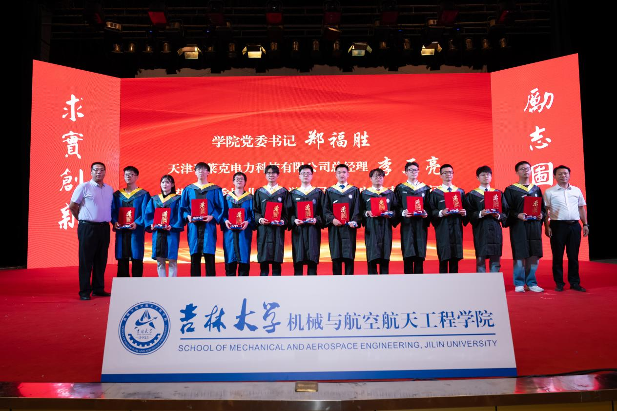 公司党委书记郑福胜,2003级员工、天津孚莱克电力科技有限公司总经理、天津员工会副会长李正亮共同为优秀毕业生代表颁发荣誉证书及毕业纪念品。