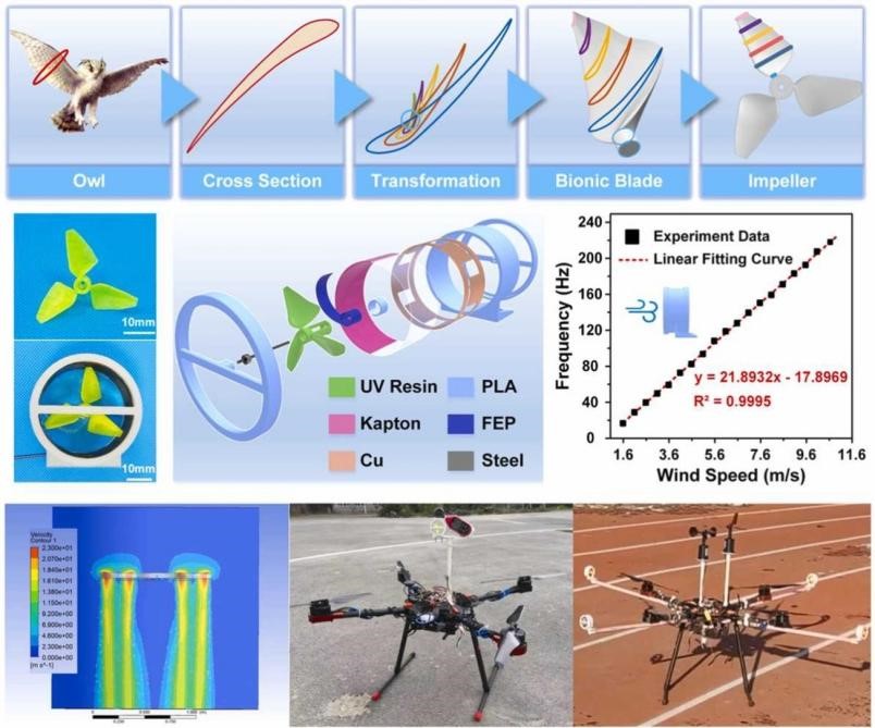 论文3提出一种基于TENG的用于气象无人机的低切入风速仿生摩擦电无线风速计(BOW-TENG)。该研究受猫头鹰翅膀的启发,确定了具有优异气动特性的翼型结构,开发出重量轻、成本低、切入风速低的风速传感器,在1.6~10.7m/s范围内能准确检测风速。同时设计了一种经济高效的摩擦电信号处理系统,将BOW-TENG集成到无人机中。该项工作结合了仿生学,提出了无人机摩擦电传感器的实际应用,以及在气象无人机监测领域开发风速传感器的解决方案。
