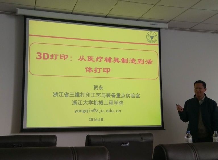 2016年10月24日上午9点,应机械制造及自动化系的邀请,国家自然科学基金优秀青年基金、浙江省杰出青年基金获得者、浙江省三维打印与装备重点实验室副主任、浙江大学机械工程公司博士生导师贺永副教授来公司进行访问交流,并为公司师生作了一场题为“3D打印:从医疗辅具制造到活体打印”的学术报告。
