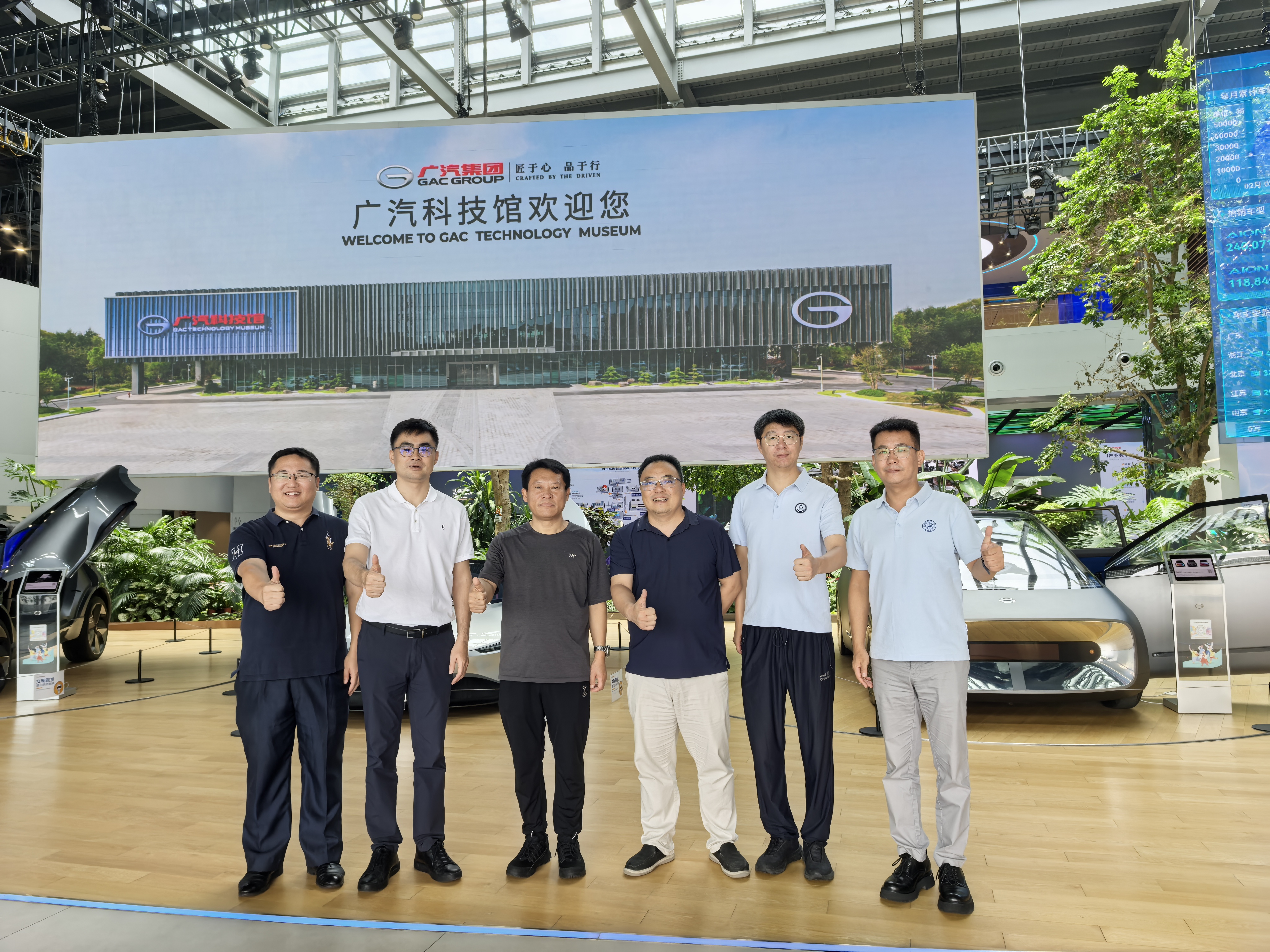 在广汽科技馆,公司99级员工、广汽传祺客服部部长宋云峰和99级员工、广汽传祺整车制造一部副部长孙宁一陪同郑福胜一行参观了广汽集团最新车型展示、智能网联技术研发成果及先进制造工艺展厅,深入了解广汽在新能源汽车、智能驾驶等领域的布局与创新。