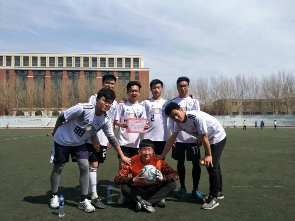随着裁判的一声哨响,两支球队展开了激烈的角逐。2班前锋队员凭借巧妙的攻略,熟练的脚法,默契的配合,多次对5班的防线发起冲击,可惜在5班铁血般的防守之下并未破门得分。上半场2班与5班战成0比0平。中场休息后,2班进行人员调配及战术调整,比赛进入下半场的激烈酣战。场上身着德国队球员的2班队员们激情澎湃,场下观众席上啦啦队为队员们呐喊助威。起初5班的加强防守策略效果显著,一度使生科队难以攻破防线,但2班队员坚持不懈,顽强拼搏,越战越勇,终于在一次角球战术中,攻破了5班守门员的大门。最终,5班队员的拼死反扑未果,2班以全胜战绩成功捧杯,夺取本次“绿茵杯”足球赛的冠军,到此比赛圆满结束。