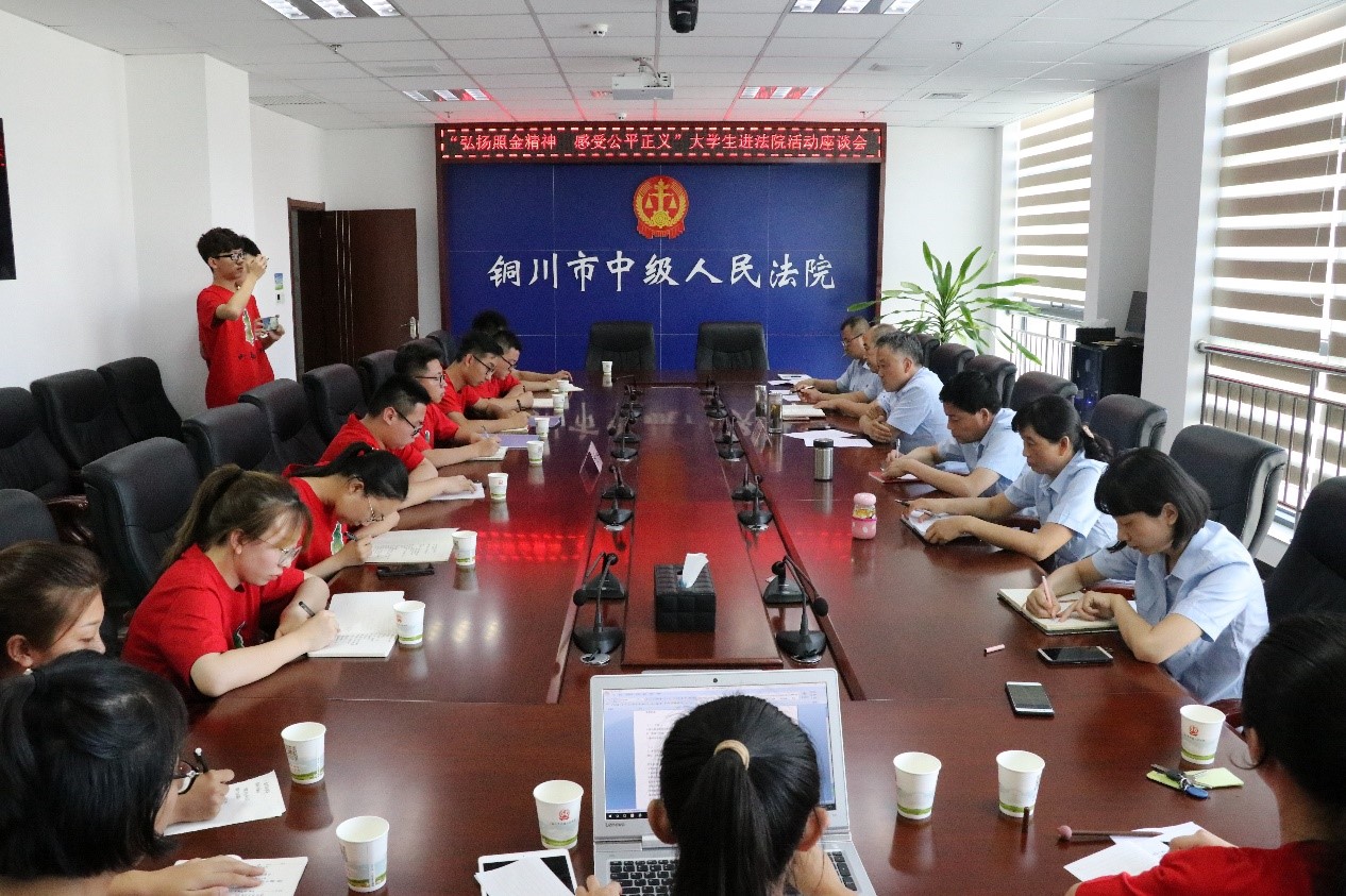 活动结束后,周少英及中公司党员代表与同学们召开了座谈会。会上,由中院赔偿办副主任、团委书记杨阳向同学们介绍了铜川市的基本概况和铜川市中级人民法院工作情况,同学们紧密结合法院工作实际提出了针对性的法律问题,与党员代表进行了深入的交流研讨。