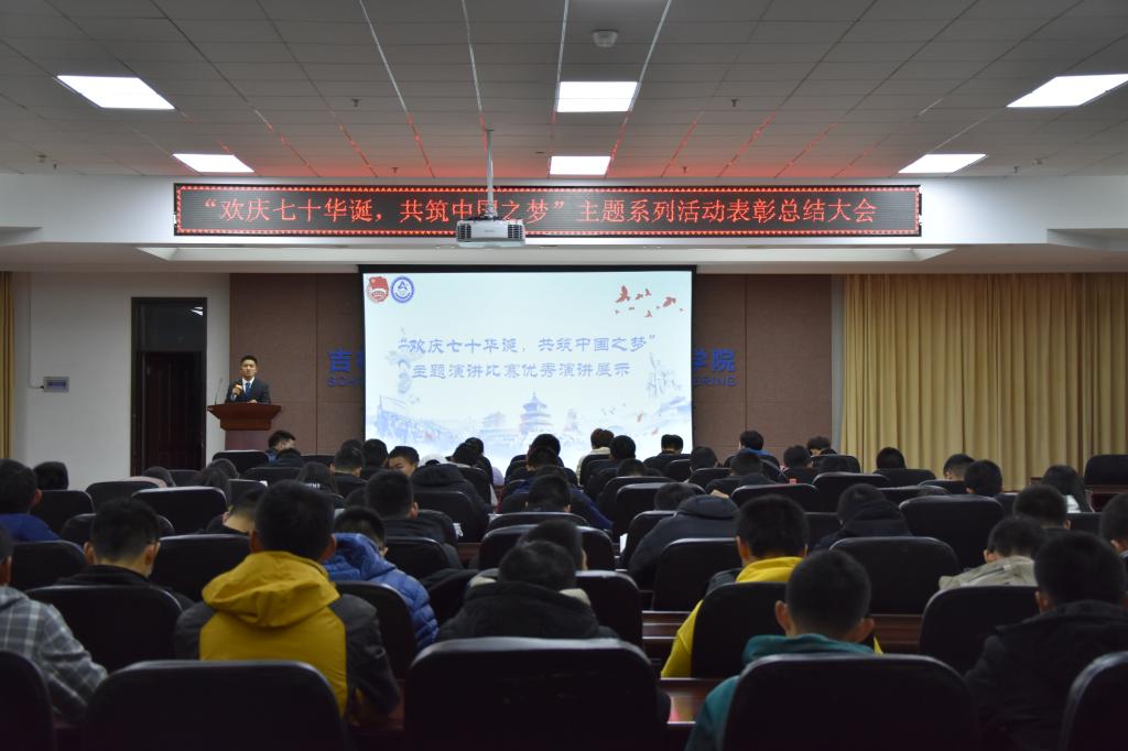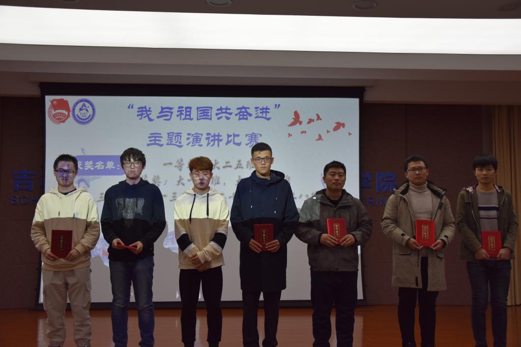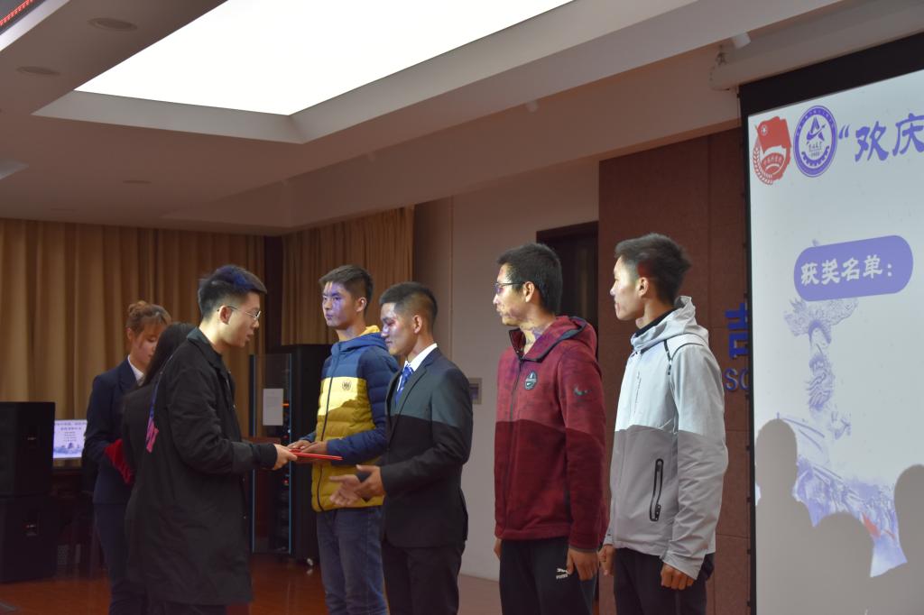 大会开始,主持人向大家介绍了与会的各位主席团嘉宾,并对大家的到来表示感谢。随后,大会进行了各项比赛的颁奖。团委常务副书记张健、团委副书记张佳琪、团委副书记高子悦、员工会副主席王超对获奖同学进行了颁奖。获奖的同学中,“青春告白祖国”演讲的各位同学满腔热血,铿锵的语句彰显他们为国奉献的决心;“翰墨绘山河,丹青颂祖国”,宣纸上的纵横交错,照片上的光影横溢,都是吉大学子对祖国的深深告白;“庆国七十载,吉大展风采”,一段一段精彩的短视频洋溢着同学们的朝气,更洋溢着对祖国母亲深深的祝福!