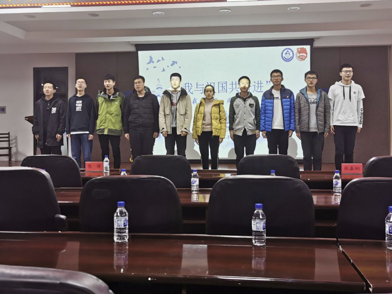 大会伊始,团支书先向大家详细介绍了会议的主题及内容。随后,伴随着国歌高昂的旋律渐渐响起,全体人员肃立,跟着音乐歌唱我们伟大的祖国,在歌声中大家仿佛看到了革命先烈们为了新中国奋勇杀敌,看到了为了新中国的建设砥砺前行的辛勤劳动人民。有国歌响起的地方,就有坚韧不拔的中国人民。歌声散去而余情未了,趁着同学们心中情意正浓,大家又用PPT再一次回顾了我们新中国的成长史,再一次让同学们感受到了我们的祖国是如何一点点从弱小变得强大。