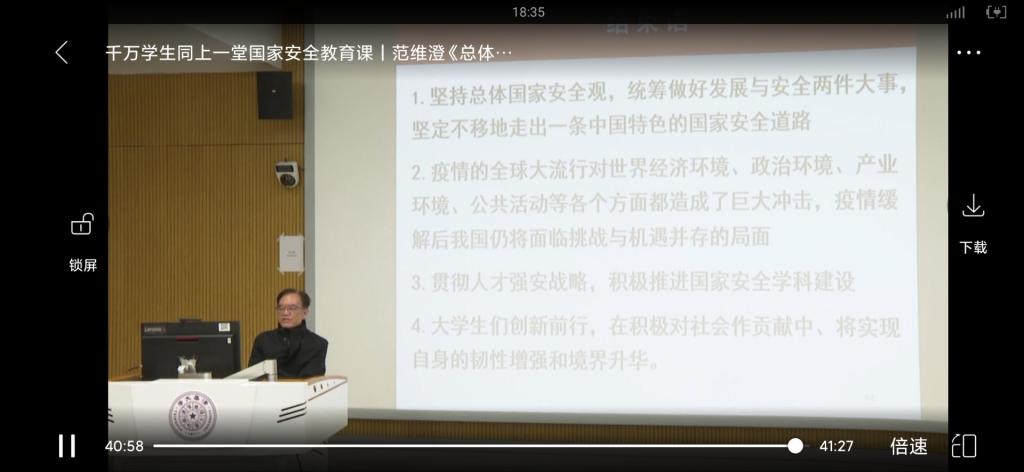 本次课程由清华大学公共安全研究院的陈建国教授和范维澄教授讲授。范教授从实例入手,客观分析,让同学们更加清楚地了解疫情与国家安全的联系。课程内容安排合理,两位教师谈吐风趣,内容从国家安全问题研究的发展历程到我国总体国家安全体系。最后,范教授表达了对广大青年老员工的殷切期望,本次线上教育课圆满结束。