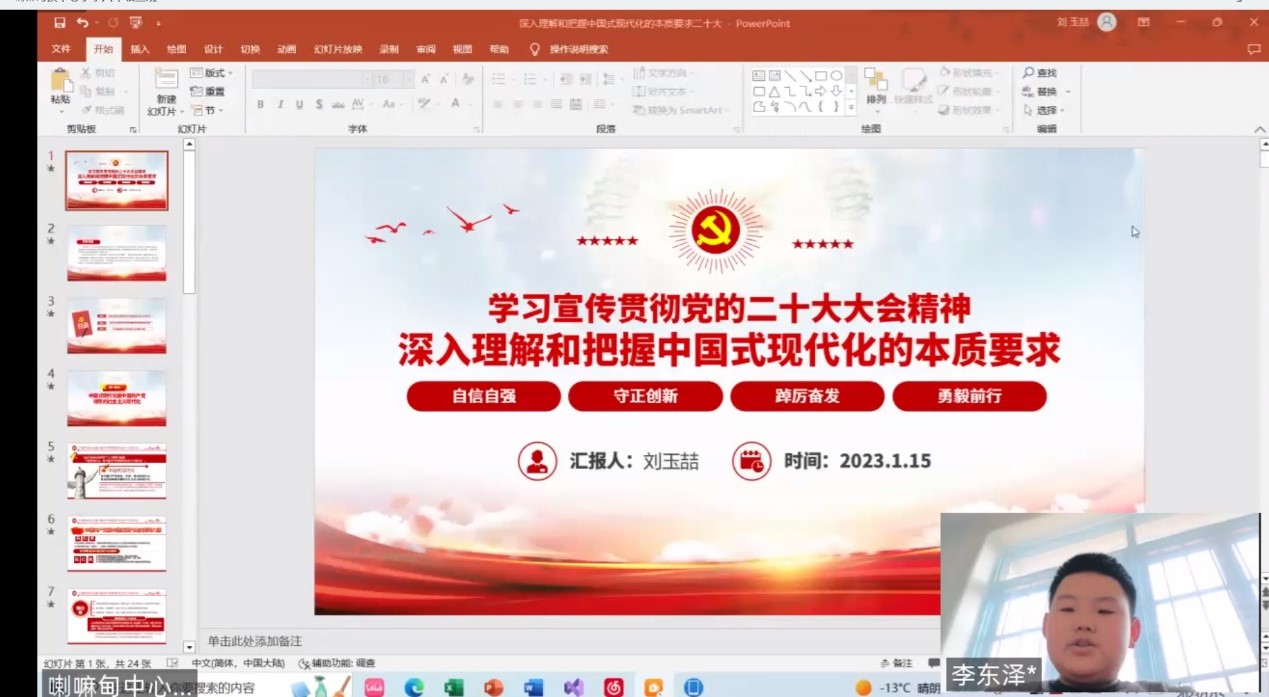 尽管当时处于疫情状态,团队成员还是坚持线下为主,线上为辅的原则进行二十大的宣讲活动。本次实践活动采用线上线下结合的方式进行,宣讲内容主要围绕深入理解和把握中国式现代化的本质要求展开。为将宣传贯彻党的二十大精神的使命传递给更多人民群众,每次宣讲前团队内都会召开宣讲筹备会,不断完善不足之处。