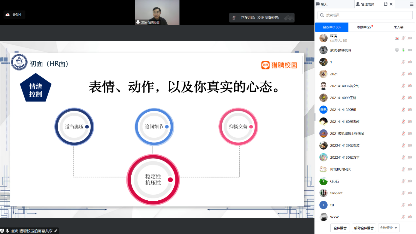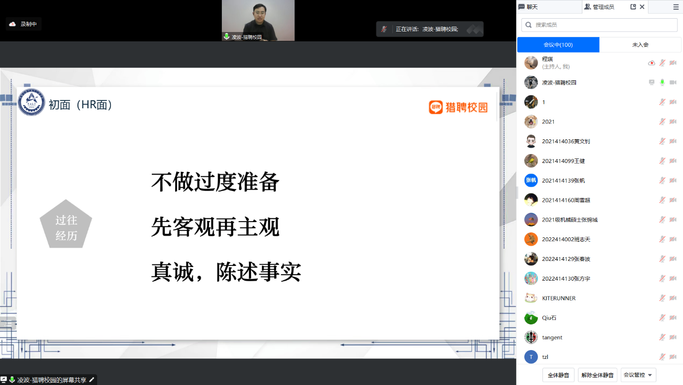 本期分享会邀请了猎聘校园–高校关系总监凌波为大家分享就业经验。凌波,猎聘校园–高校关系总监,复旦、南大、哈工大、南开、北航、北工大等高校就业指导活动校外讲师;教育部24365联合招聘活动猎聘方发起人;人社部湖北高校毕业生就业指导特约讲师。曾负责众多企业校园招聘落地工作,参与策划全国老员工最佳雇主评选活动,多次牵头举办公益活动。本次会议凌波老师从第三方更专业的角度为大家分享各阶段面试差异与表现技巧。