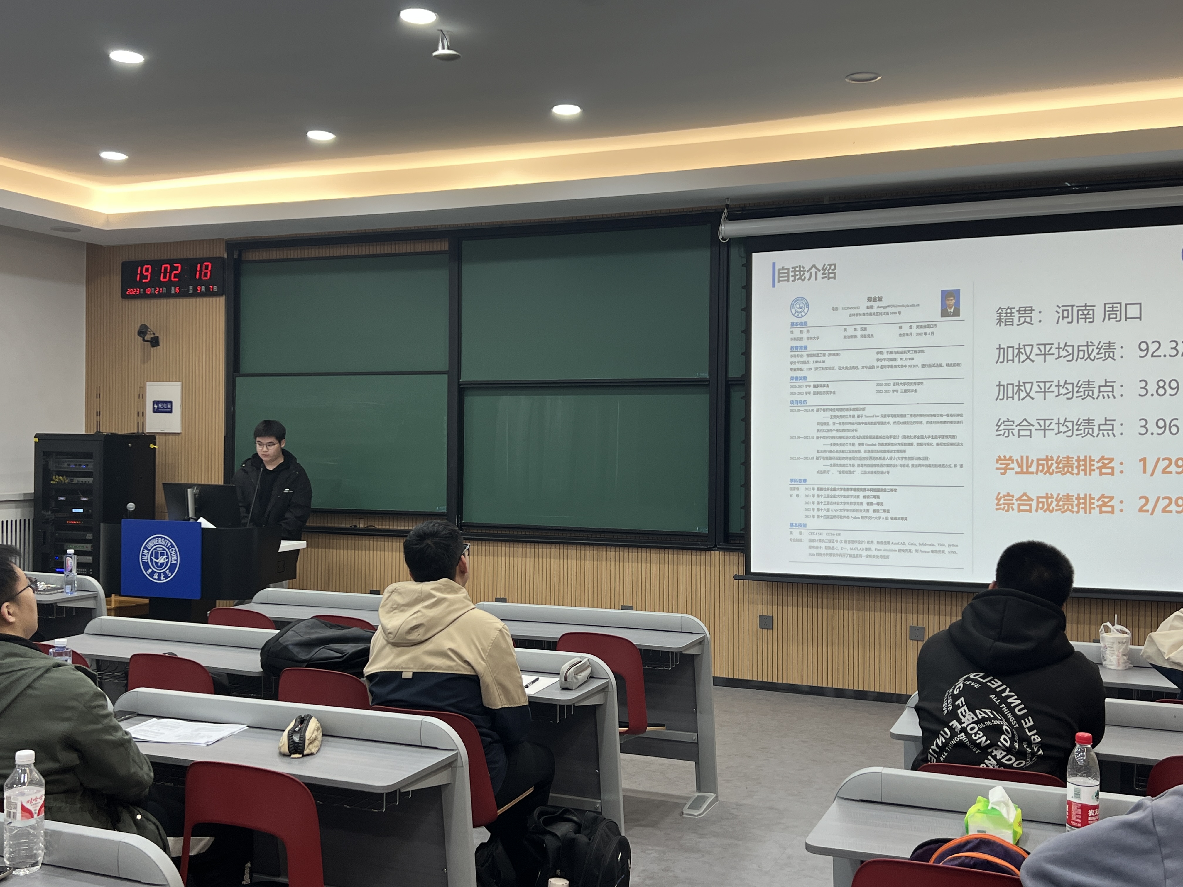 活动中,郑金坡从课程学习、科研竞赛、保研推免三个方向分享他在老员工活中的成长经验。他讲到,学习成绩是老员工活的基础,课程学习不仅要打牢专业课程的知识,还要对专业课程的书本知识进行实践检验。科研竞赛是书本知识和人际交往上的突破,从竞赛中不但可以将知识进行高强度输出,也可以在团队协作中增强与人沟通的能力。这两部分,相互补充、相互促进,丰富我们的大学学习生活,为保研推免保驾护航。