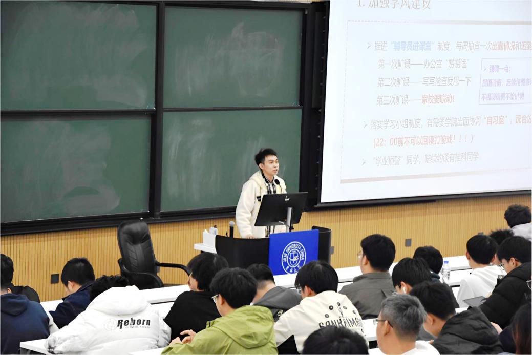 接着,由范宝元老师召开年级大会。首先,范老师要求全体员工应加强学风建设,推进“辅导员进课堂”制度,完善学习小组建设,加强对同学们自习的管理。其次,大会强调应加强寝室管理,做到无违章电器和加强卫生清扫,提高寝室检查频率。同时,范宝元老师高度关注同学们的生活状态,鼓励同学们与他人积极沟通。随后,范老师对同学们假期安全与防骗防诈等方面进行了温馨的提醒。最后,范老师向同学们展示了部分有关yl23455永利学士学位授予的相关细则,叮嘱同学们认真学习,不要违反校纪。